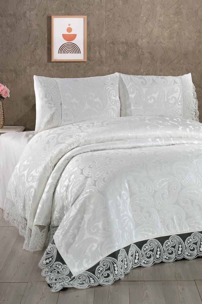 Çeyiz Diyarı Şal 3 Parça Çift Kişilik Yatak Örtüsü Krem