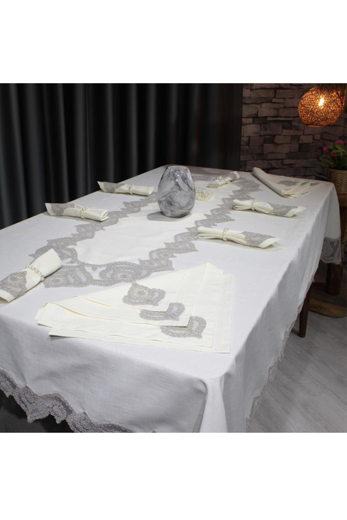 Çeyiz Diyarı Kar Tanesi 26 Parça Masa Örtüsü Takımı Krem-Gri