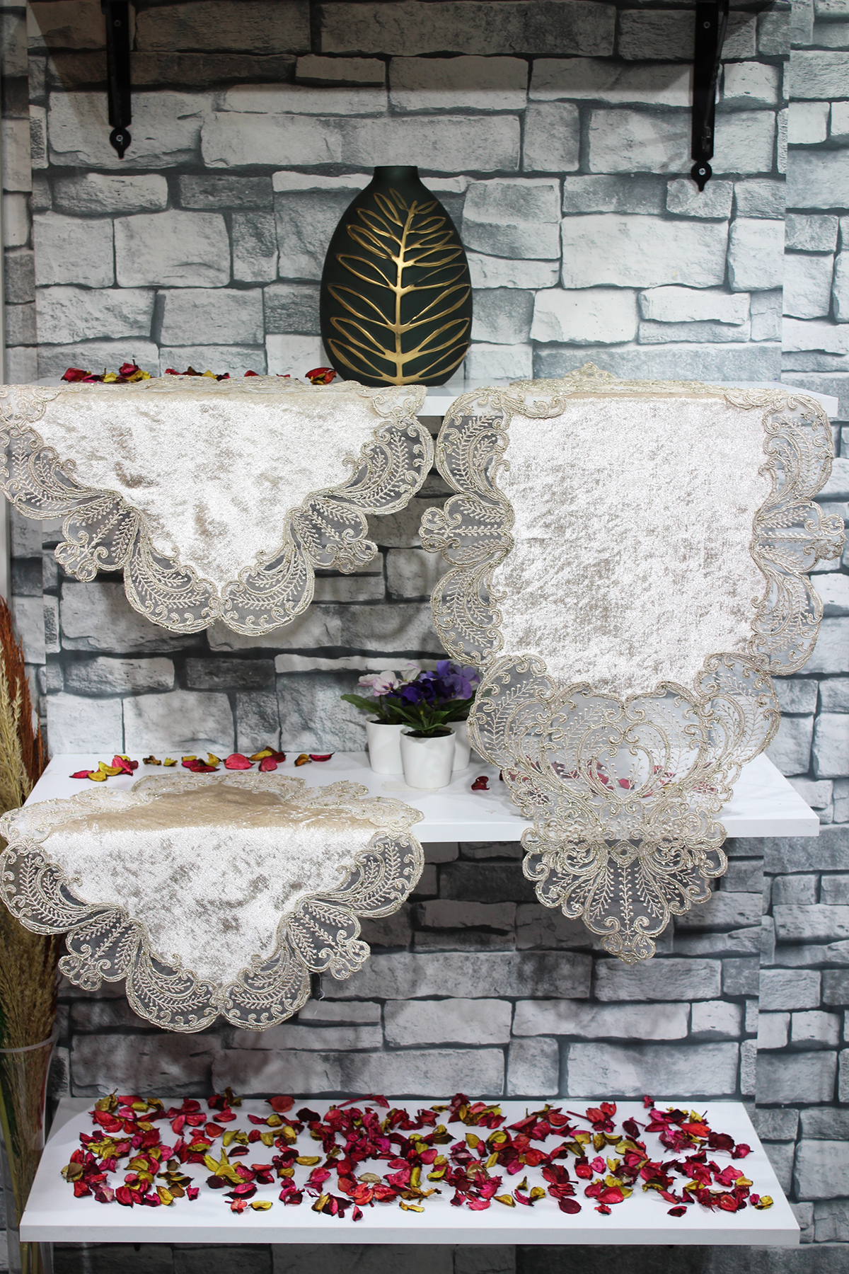 Yasemin 3 Parça Yatak Odası Takımı Marka: Çeyiz Diyarı Konsol Örtüsü: 90x33 CM 1 Adet Komodin Örtüsü: 45x45 CM 2 Adet YIKAMA TALİMATI -Makinada veya elde yıkayabilirsiniz max 40 derecede yıkayınız. -Çamaşır suyu ile leke sökücü kimyasallar kullanmayınız. -Yıkama esnasında koyu renkleri mümkün olduğunca ayrı tutunuz. -Ilık ütü ile ütüleyiniz. -Islak bekletmeyiniz. -Kurutma makinasında kurutulabilir.