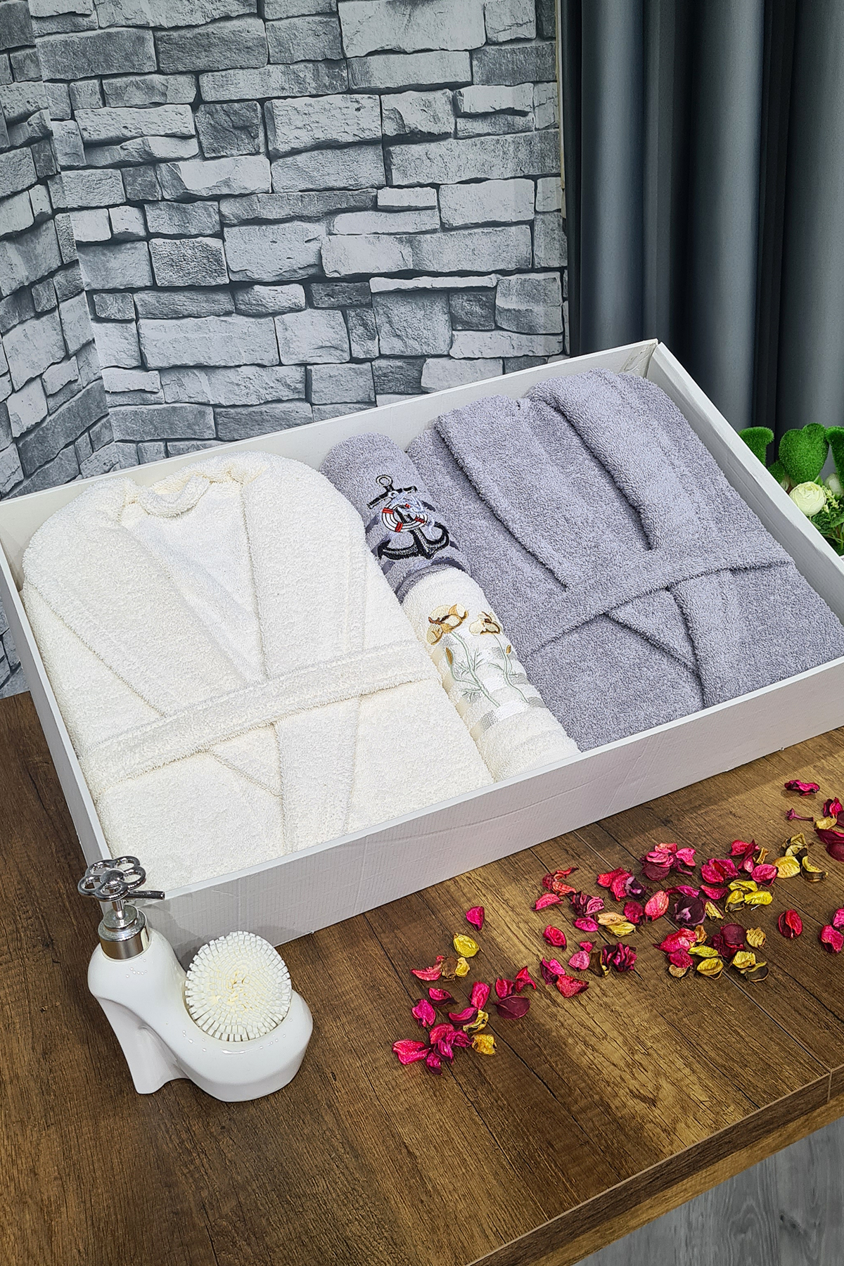 Çeyizlik Aile Bornoz Seti 4 Parça Krem Gri