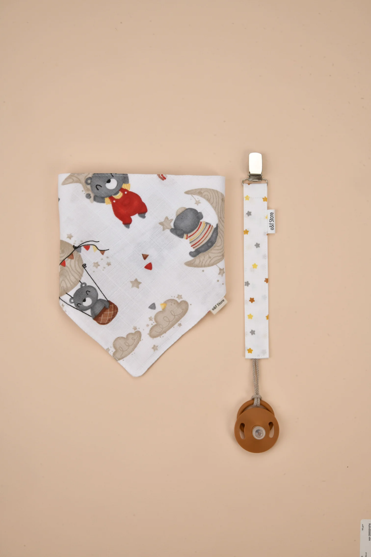 İkinci Şans - Organik Sertifikalı Çift Katlı Müslin Mama Önlüğü ve %100 Pamuk Yıldız Emzik Askısı Seti