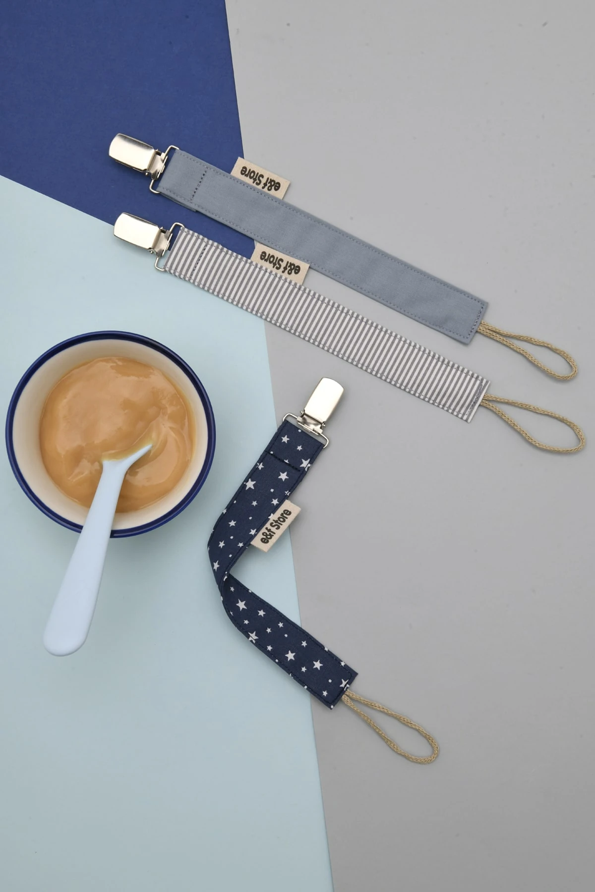 Yerli üretimdir ve El Yapımıdır. %100 Pamuk Poplin Kumaş, %100 Pamuk İp ve Nikel Kaplı Metal Kullanılmıştır. Oldukça Pratik Olan Emzik Askısını Tüm Kıyafetlere Kolayca Takabilirsiniz. Kopmaya Dayanıklıdır. Elde Yıkamaya Uygundur. Boyutları: 2,5 cm*27 cm 3 Adet Olarak Gönderilmektedir. Bebek Hediyesi Paketinin İçeriği:1 Adet Yıldız Desenli Lacivert, 1 Adet İndigo Mavi, 1 Adet Gri Beyaz Çizgili UYARI: Küçük Parçalar İçerdiği İçin Yetişkin Gözetiminde Kullanılmalıdır.