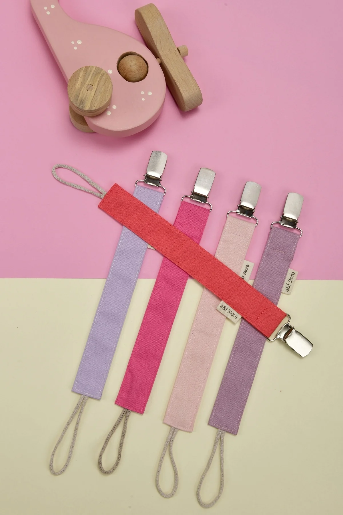 Yerli üretimdir ve El Yapımıdır. %100 Pamuk Poplin Kumaş, %100 Pamuk İp ve Nikel Kaplı Metal Kullanılmıştır. Oldukça Pratik Olan Emzik Askısını Tüm Kıyafetlere Kolayca Takabilirsiniz. Kopmaya Dayanıklıdır. Elde Yıkamaya Uygundur. Boyutları: 2,5 cm*27 cm 5 Adet Olarak Gönderilmektedir. Bebek Hediyesi Paketinin İçeriği:1 Adet Lila, 1 Adet Fuşya, 1 Adet Nar Çiçeği, 1 Adet Toz Pembe, 1 Adet Gül Kurusu UYARI: Küçük Parçalar İçerdiği İçin Yetişkin Gözetiminde Kullanılmalıdır.