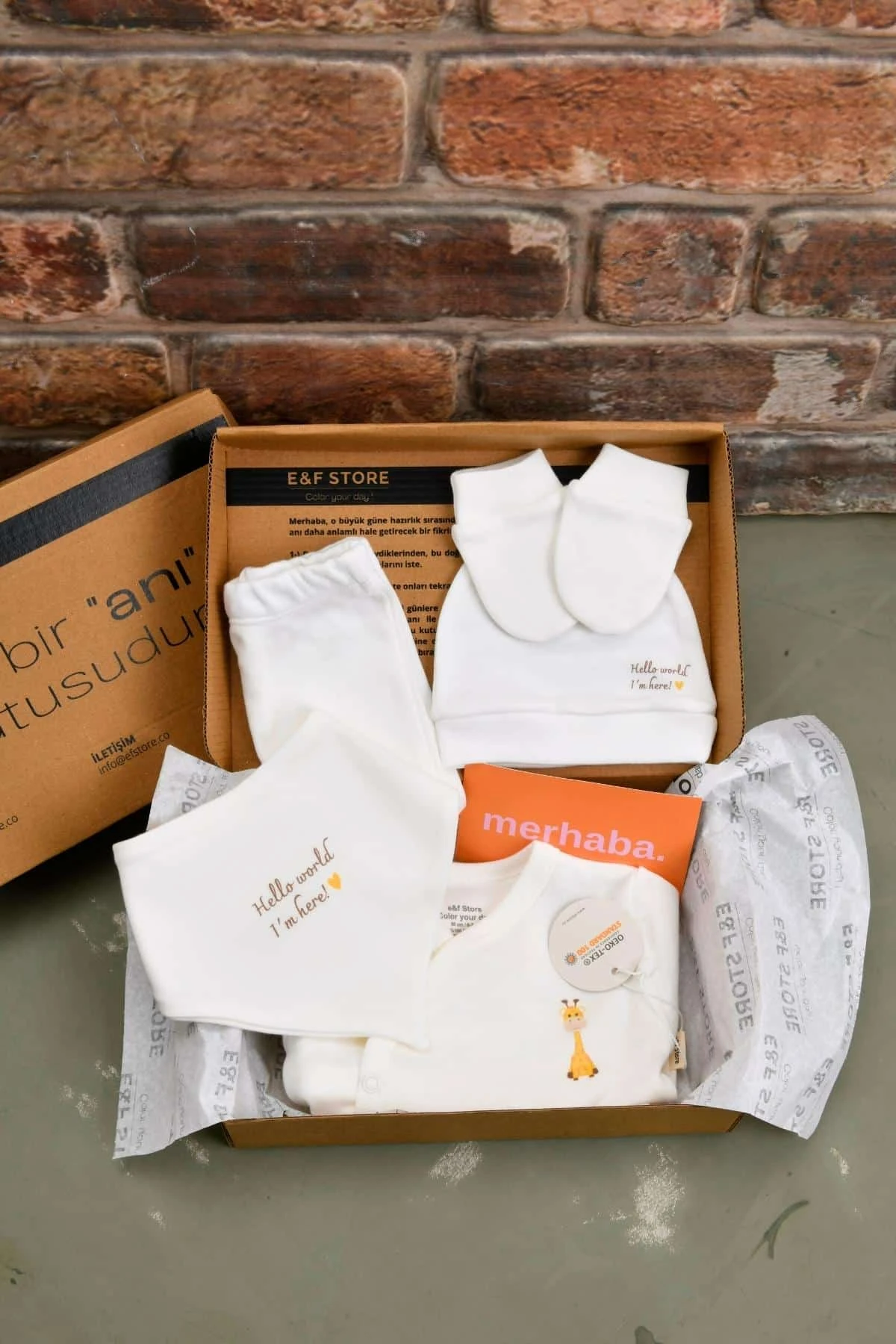 e&f Store yepyeni bir koleksiyonla, hastane çıkışı seti ile senin yanında! Tüm üretim ve tasarım aşaması tescilli markamız olan e&f Store’a ait “Zürafa Desenli” bu takımın detaylarına birlikte bakalım. Bedeni 0-3 Ay/56 cm’dir. Unisex kullanıma uygundur. Butik üretim anlayışı ile Türkiye’de üretilmiştir. Harika bir yenidoğan doğum hediyesi olarak değerlendirilebilir. Sürpriz kutusu ile birlikte gönderilecektir. Set İçeriği: 1 adet üst, 1 adet alt, 1 çift eldiven, 1 adet önlük, 1 adet şapka toplam 5 parçadır. Üst Parça Detay: Oeko-Tex Standard 100 sertifikalı pamuk kumaştan üretilmiştir. Anvelop kesimli olup bebeğin bedenini rahat bir şekilde sarar ve onu korur. Göğüs üzerinde Zürafa baskı detayı bulunmaktadır. Dıştan çift içten tek çıtçıtlıdır. Tüm desenlerin çizimi ve ürün tasarımı e&f Store’a aittir. Alt Parça Detay: Oeko-Tex Standard 100 sertifikalı pamuk kumaştan üretilmiştir. Beli lastikli paçası kendinden çoraplıdır. Şapka Detay: Oeko-Tex Standard 100 sertifikalı pamuk kumaştan üretilmiştir. Kuyruksuz şapka modelinin kullanımı oldukça rahat ve konforludur. Bebeğin kafasını dış hava koşullarından korur. Üzerinde bebeğin dünyaya verdiği ilk selamı niteliğinde baskı detayı vardır. Önlük Detay: Çift katlı Oeko-Tex Standard 100 sertifikalı pamuk kumaştan üretilmiştir. Ense kısmı çift çıtçıtlıdır. Üzerinde bebeğin dünyaya verdiği ilk selamı niteliğinde baskı detayı vardır. Eldiven Detay: Oeko-Tex Standard 100 sertifikalı pamuk kumaştan üretilmiştir. Bilek kısmı biye ile üretilmiş olup bilekleri sıkmayacak şekilde tasarlanmıştır. Yıkama Talimatı Çamaşır makinesinde yıkamaya uygundur. 30 derecede diğer bebek ürünleri ile birlikte yıkanmalıdır. Ağartıcı kullanılmaz. Tamburlu kurutma yapılmaz. Düşük ısıda ütüleyiniz.