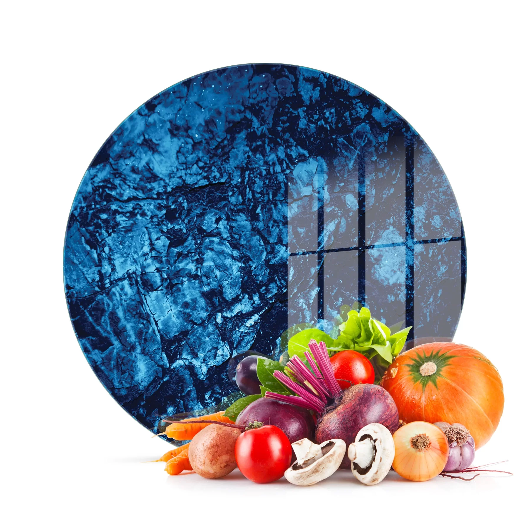 Decovetro Cam Kesme Tahtası ve Sunumluk Yuvarlak Mavi Taş Desenli 30x30 Cm