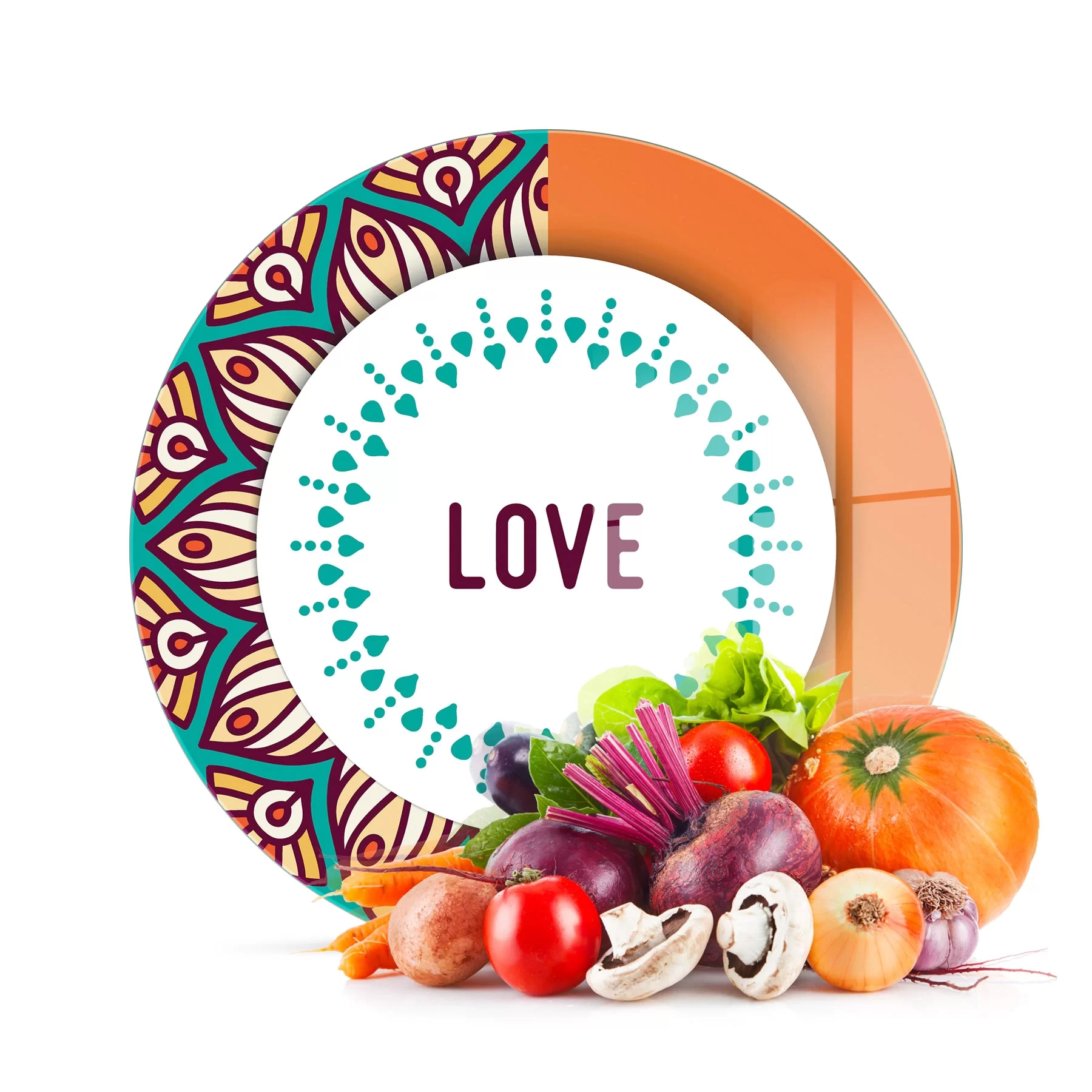 Decovetro Cam Kesme Tahtası ve Sunumluk Yuvarlak Turuncu Love Desenli 30x30 Cm