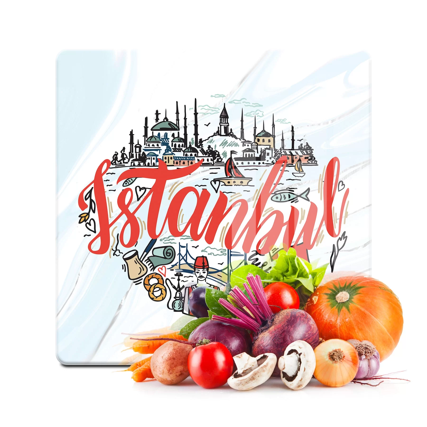 Decovetro Cam Kesme Tahtası ve Sunumluk Kare İstanbul Kolaj Desenli 30x30 Cm