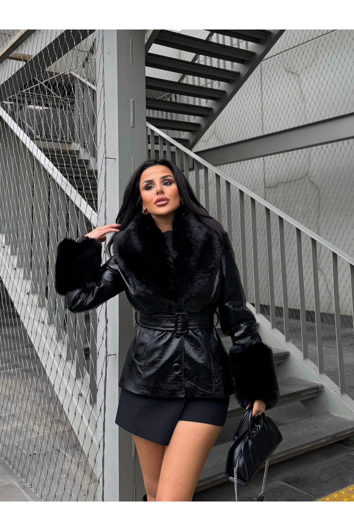 Beli kuşak bağlamalı, kol ucu kürk, yakası kürk detaylı,suni deri kaban