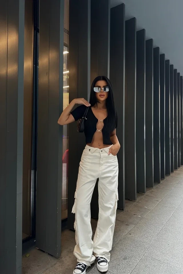 White Cargo Pocket Jean It is made of gabardine fabric. Size XS is used in the image. Jean length is 104 cm, waist is 32 cm. Model Measurements Height 158 ​​Weight 54 Chest 80 Waist 62 Hip 97