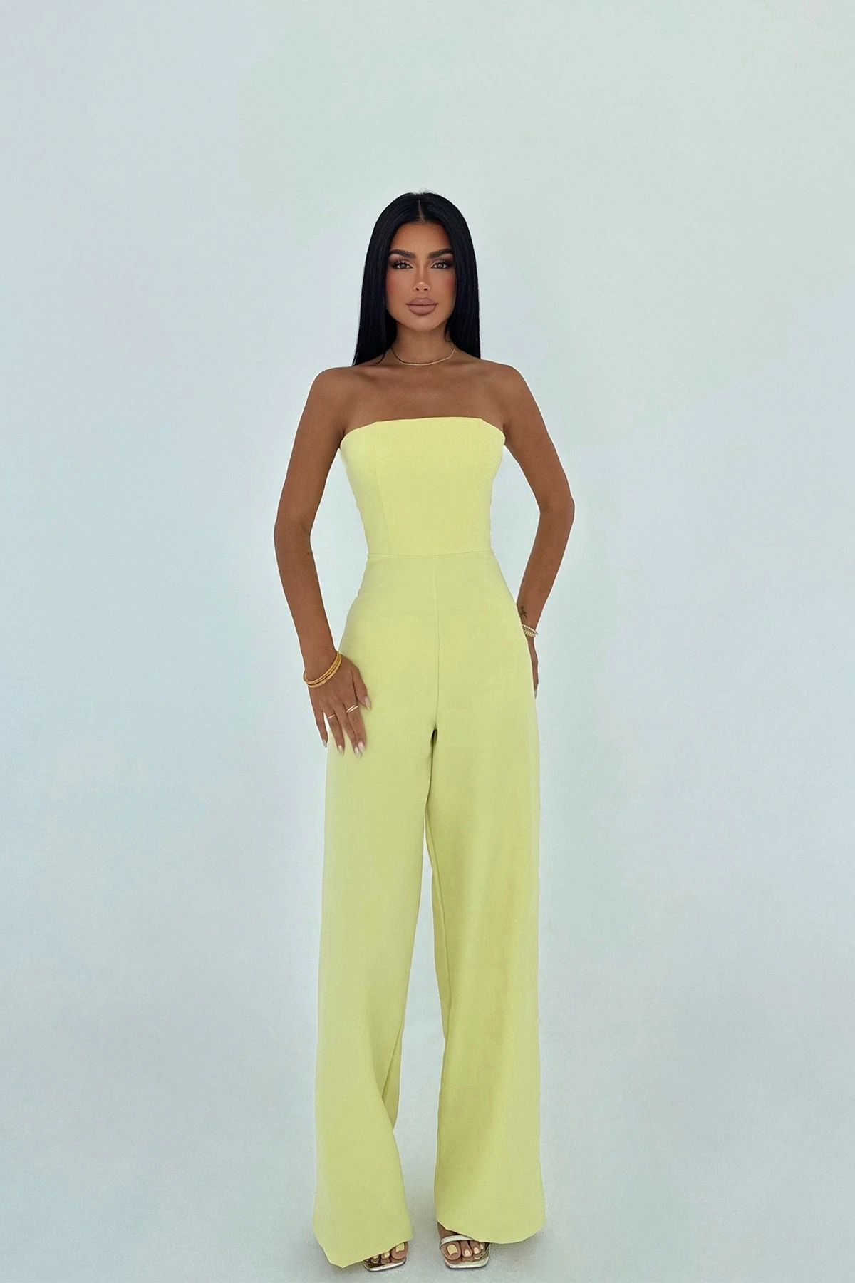 Yellow Strapless Jumpsuit Size XS is shown in the image. Made of Double Fabric. Height: 123 cm, Waist: 33 cm, Chest: 37 cm Model Measurements: Height: 158 cm, Weight: 52 cm, Chest: 80 cm, Waist: 62 cm, Hips: 93 cm