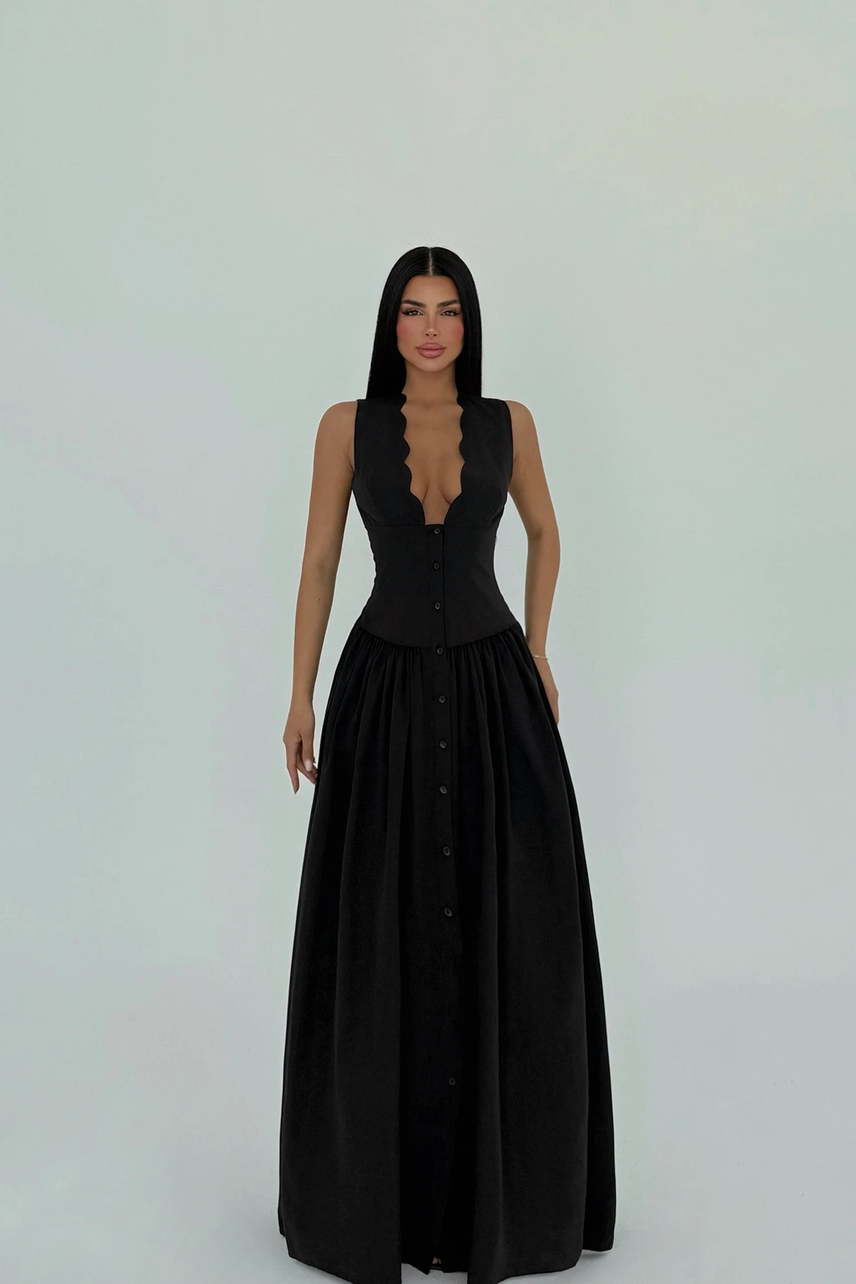 Black Button Detail Dress XS size is used in the image. Made of Poplin Fabric. Length: 144 cm Waist: 35 cm Chest: 36 cm Model Measurements Height 158 ​​Weight 52 Chest 80 Waist 62 Hip 93