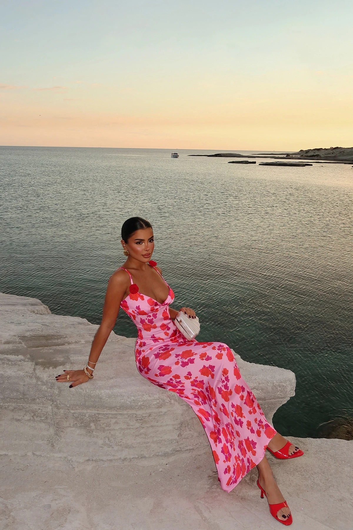Pink Margot Floral Patterned Dress XS size is used in the image. Dress Upper Length: 142 cm Waist: 38 cm Chest: 35 cm Made of Satin Fabric. Model Measurements Height 158 ​​Weight 52 Chest 80 Waist 62 Hip 93
