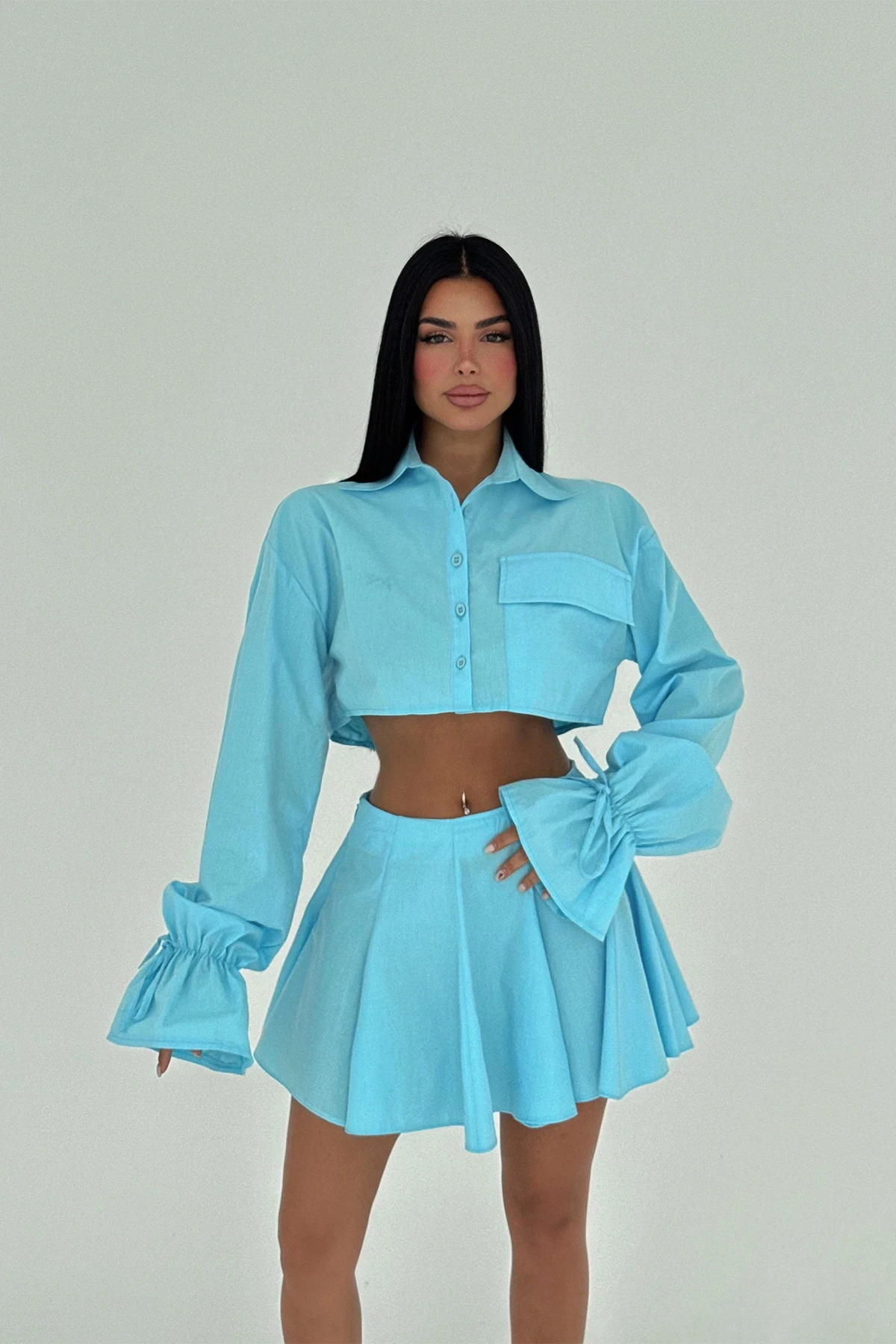 Blue Jila Mini Skirt Top Shirt Set The image uses size XS. Suit top length 38 cm, Chest 48 cm, Bottom length 38 cm, Waist 34 cm Model Measurements Height 158 ​​Weight 52 Chest 80 Waist 62 Hip 93