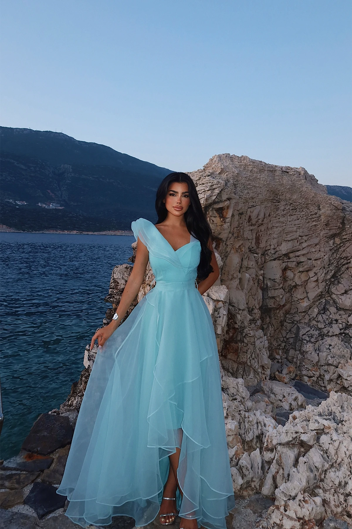Turquoise Tulle Detail Long Evening Dress In the image, size 36 is used. Height: 170 cm Waist: 33 cm Chest: 36 cm Model Measurements Boy 158 Weight 52 Chest 80 Waist 62 Hip 93