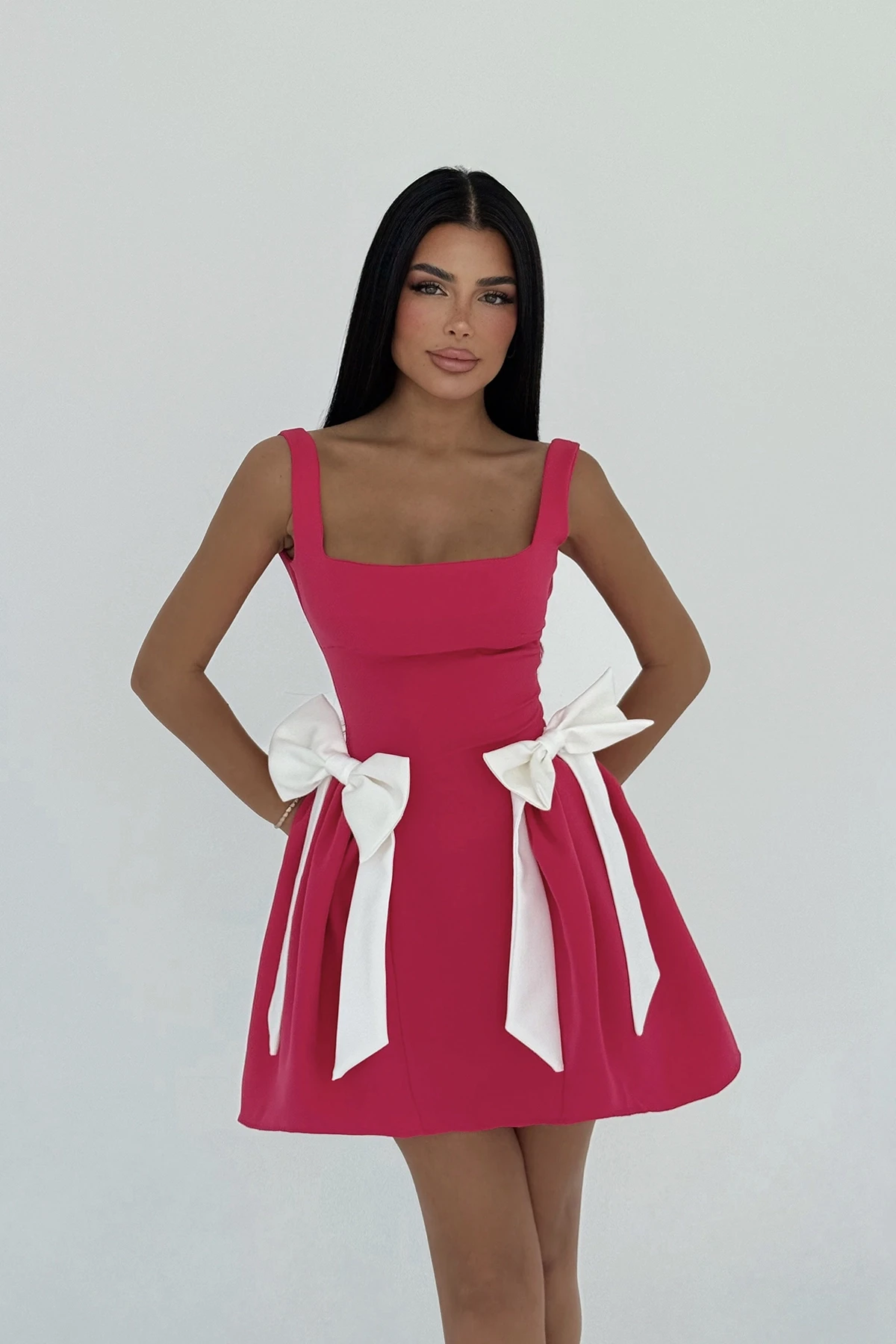 Fuchsia Nellie Bow Detail Mini Dress The image uses size XS. Length: 76 cm Waist: 43 cm Chest: 41 cm Model Measurements Height 158 ​​Weight 52 Chest 80 Waist 62 Hip 93