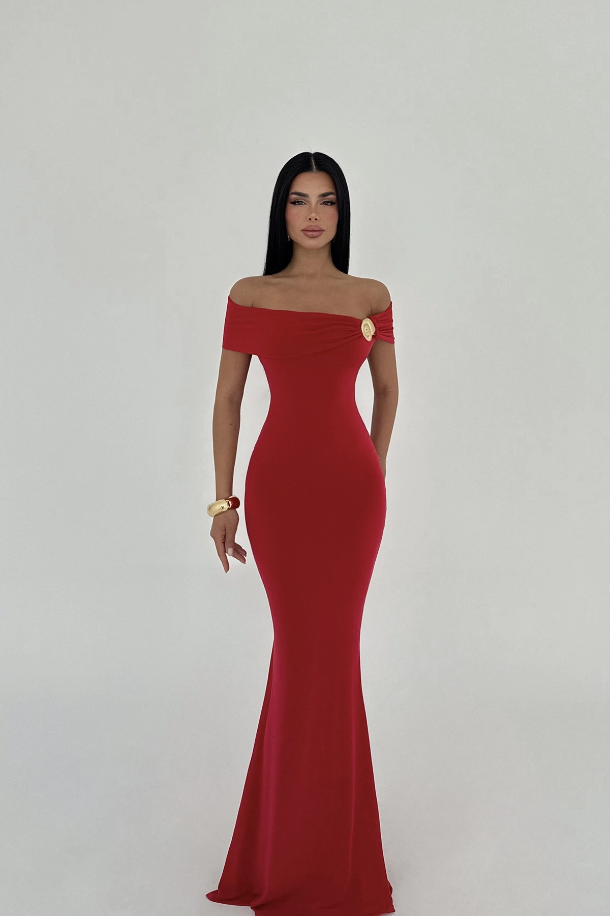 Red Seridie Seashell Detail Long Dress Made of Sandy Fabric. The image shows size XS. Length: 140 cm Waist: 33 cm Chest: 37 cm Model Measurements Height 158 ​​Weight 52 Chest 80 Waist 62 Hip 93
