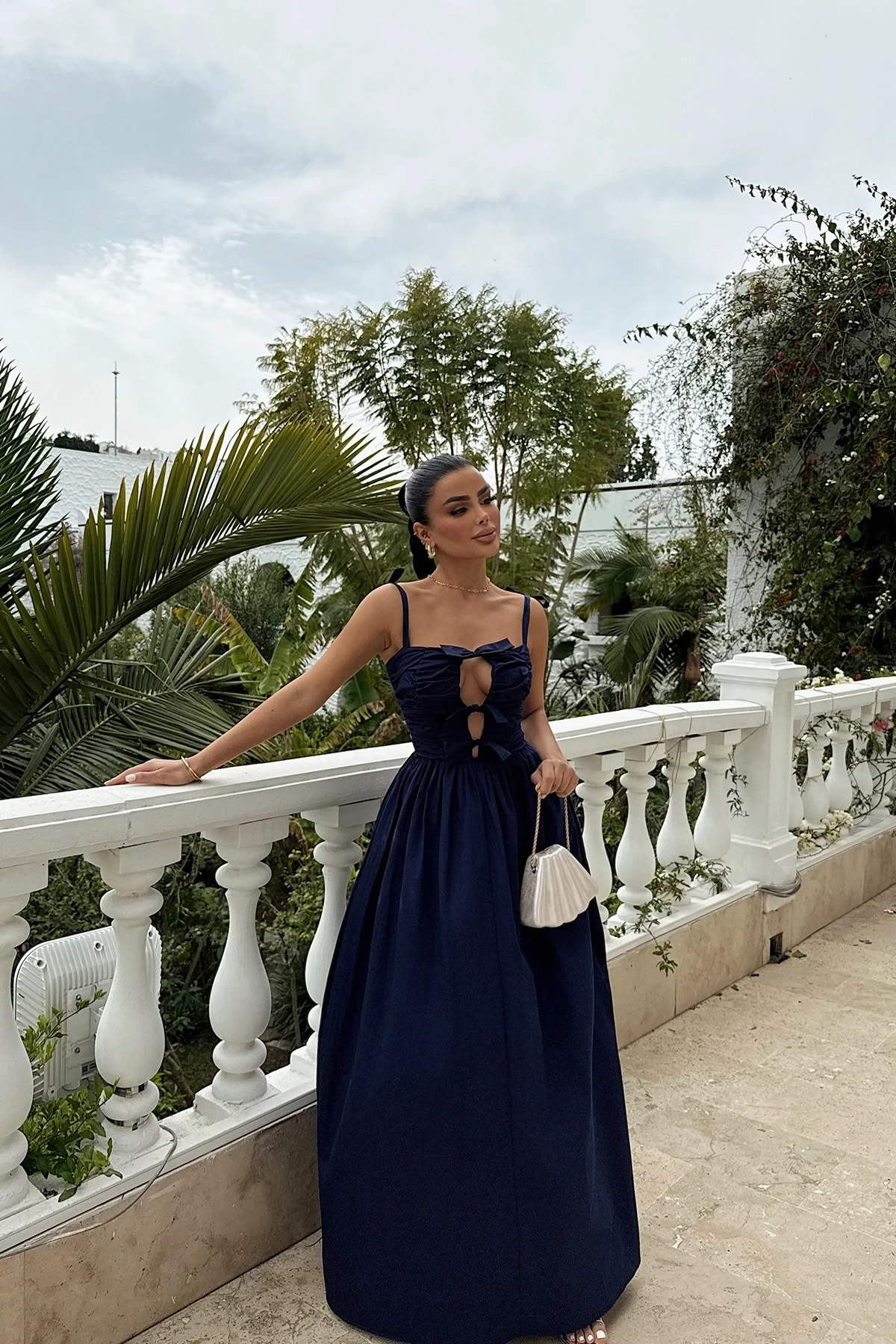 Navy Blue Mirabelle Long Dress Made of Poplin Fabric. Length: 120 cm Waist: 32 cm Chest: 40 cm XS size is used in the image. Model Measurements Height 158 ​​Weight 52 Chest 80 Waist 62 Hip 93