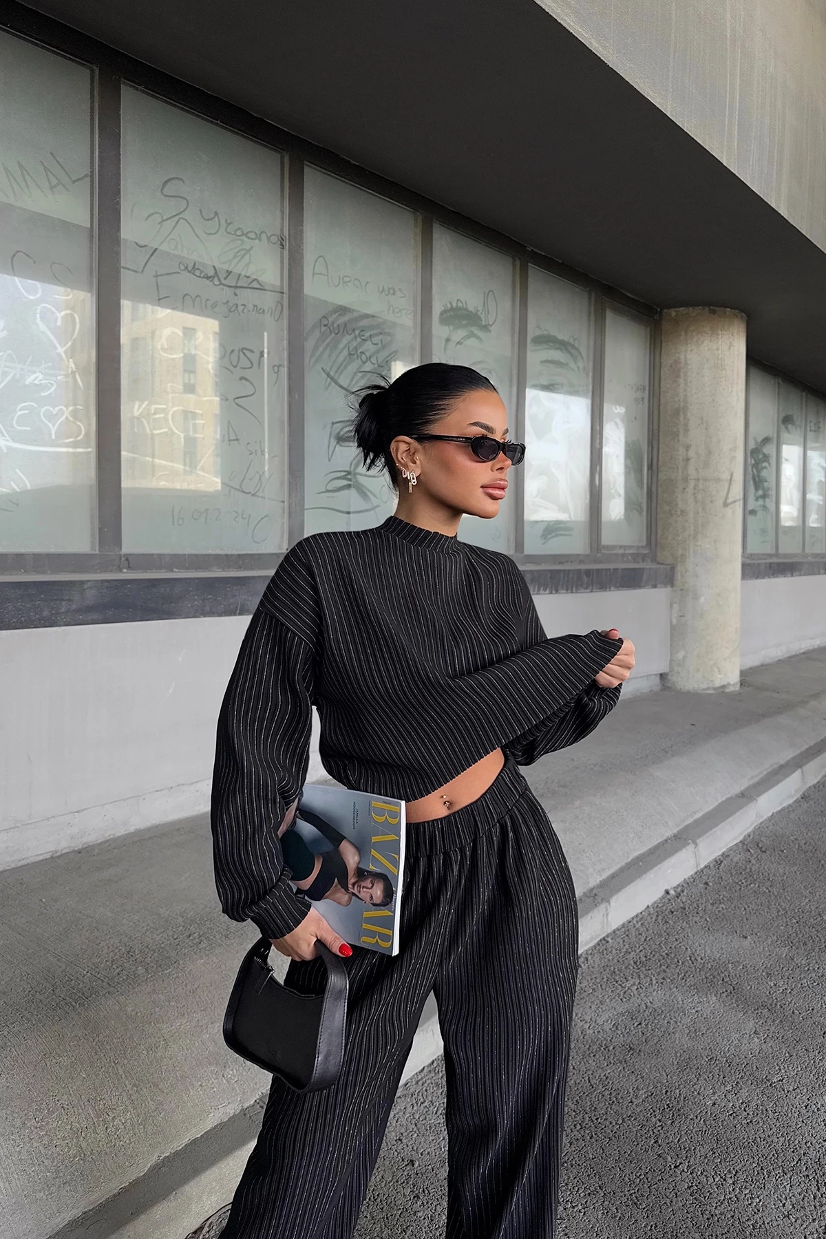 Black Albinia Set XS size is used in the image. Top Length: 59 cm Chest: 64 cm Bottom Length: 107 cm Waist: 39 cm Model Measurements Height 158 ​​Weight 52 Chest 80 Waist 62 Hip 93