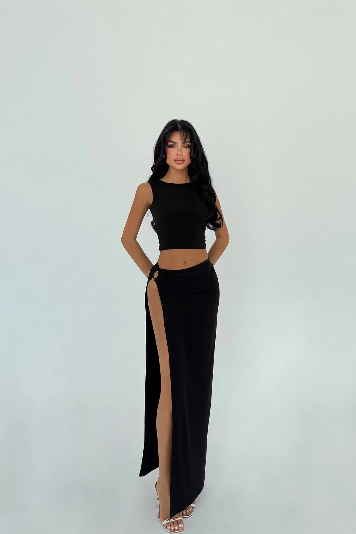 Black Skirt Suit XS size is used in the image. Made of Sandy fabric. Suit upper length 60 cm, Chest 34 cm, Bottom length 100 cm, Waist 36 cm Model Measurements Height 158 ​​Weight 52 Chest 80 Waist 62 Hip 93