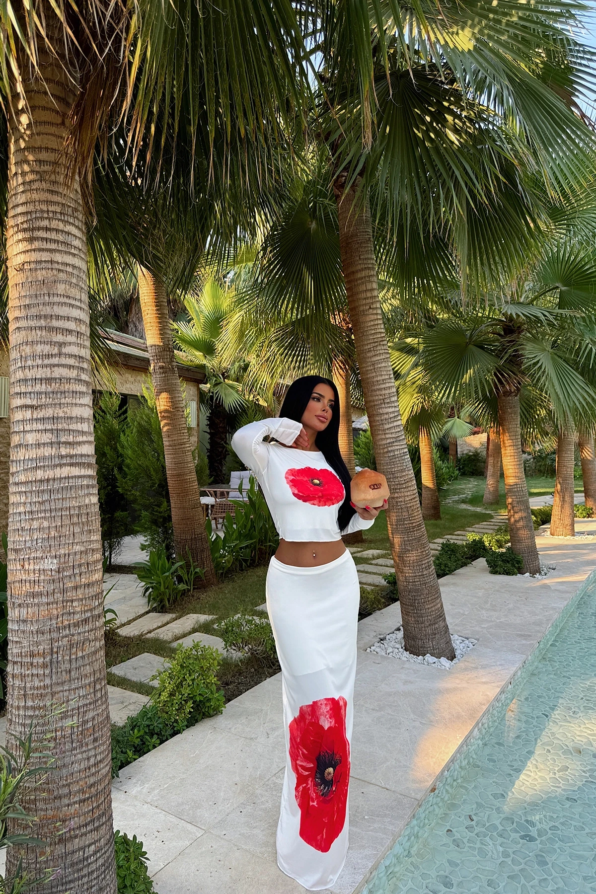 White Rose Detail Skirt Suit Made of Sandy fabric. S size is used in the image. Suit top length 41 cm, Chest 40 cm, Bottom length 98 cm, Waist 32 cm Model Measurements Height: 160 Weight: 50 Chest: 80 Waist: 62 Hip: 94
