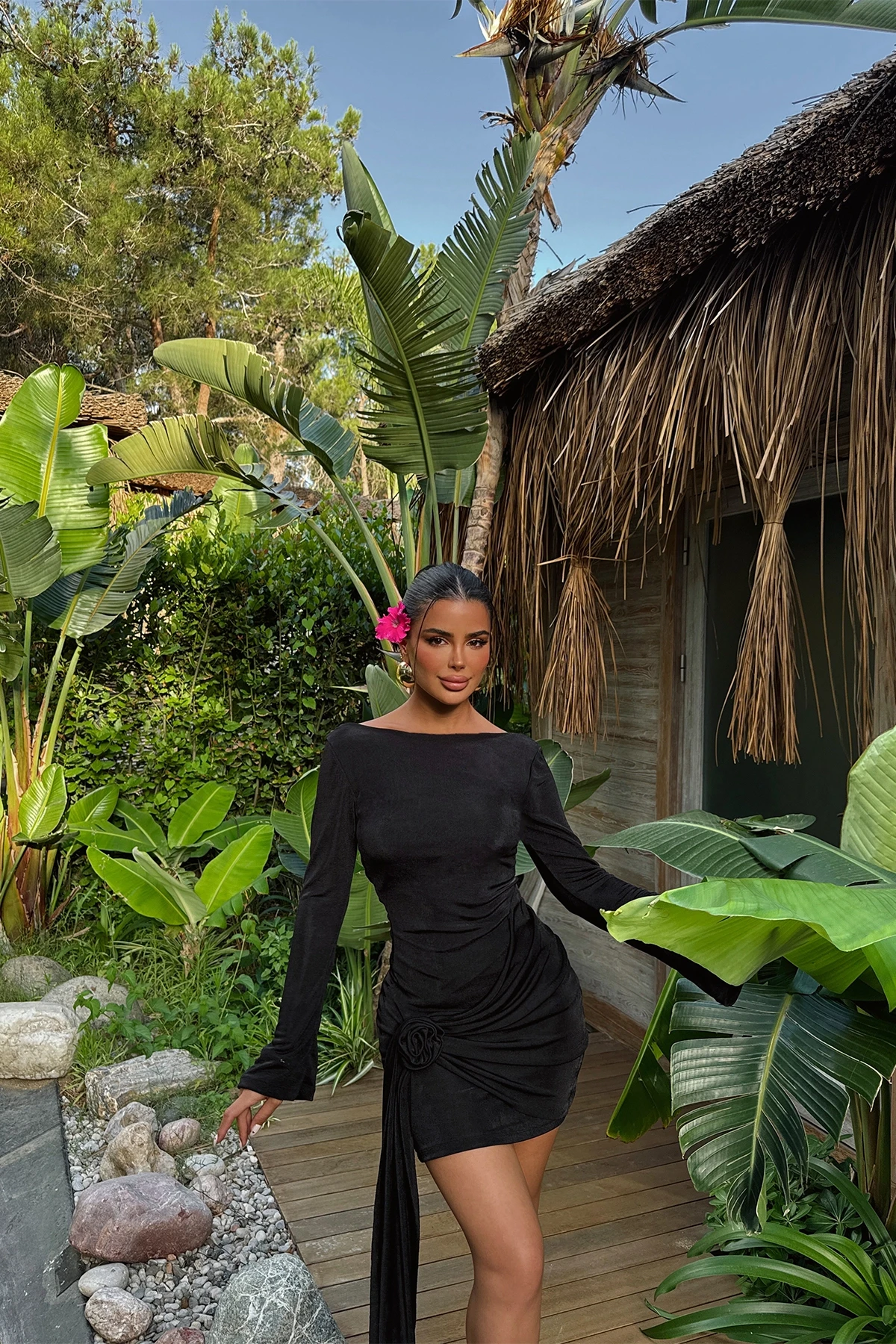 Black Front Rose Detail Long Sleeve Dress It is made of buzzy fabric. Size S is used in the image. Dress Length: 84 Cm, Chest: 32 Cm, Waist: 28 Cm, Hips: 35 Cm Model Measurements: Height: 160 Weight: 50 Chest: 80 Waist: 62 Hip: 94