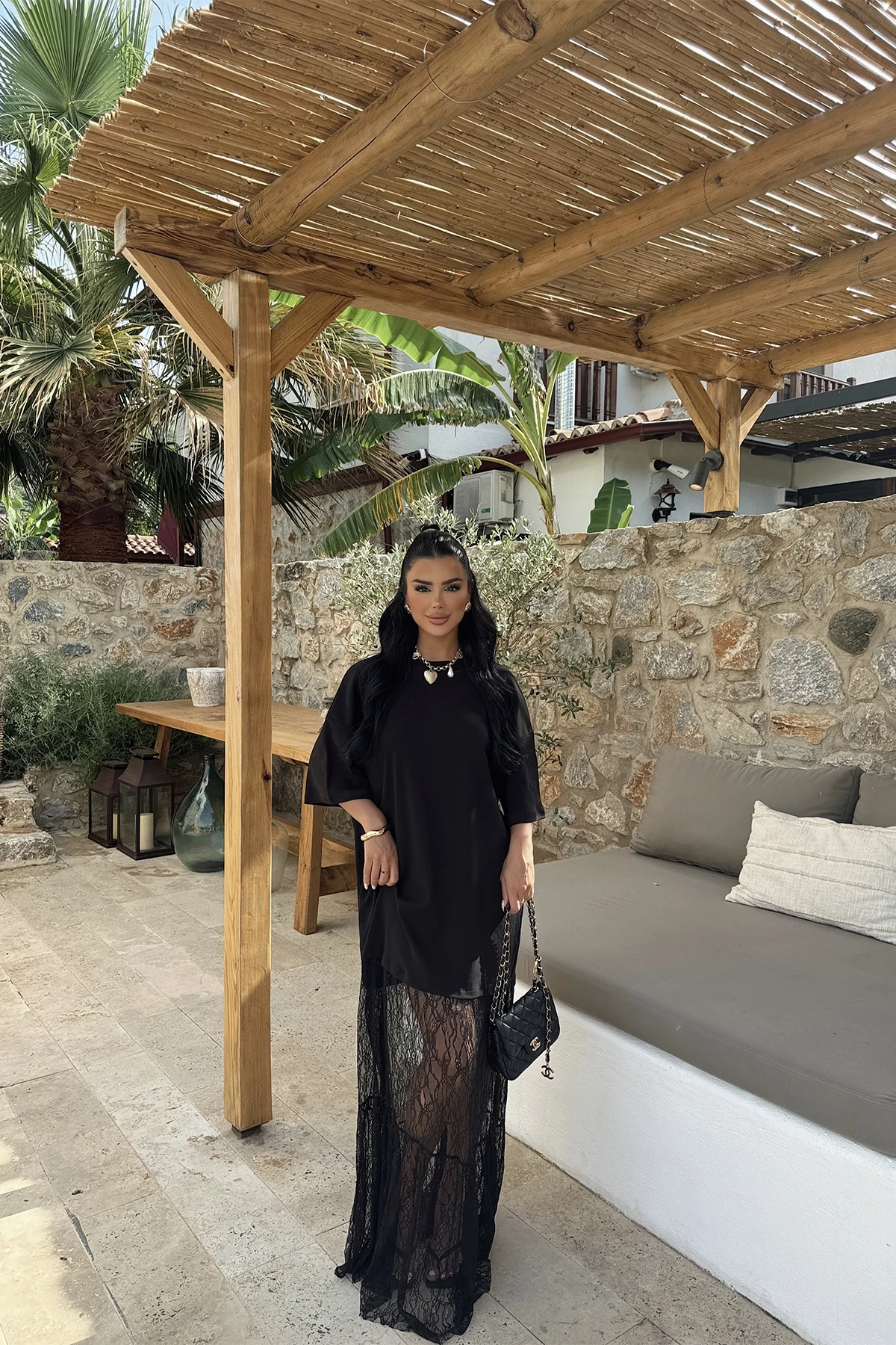 Black Lace Detail Long Dress Made from Interlock Fabric Image size S is used Dress Length: 148 cm Bust: 62 cm Model Measurements: Height: 160 Weight: 50 Chest: 80 Waist: 62 Hip: 94
