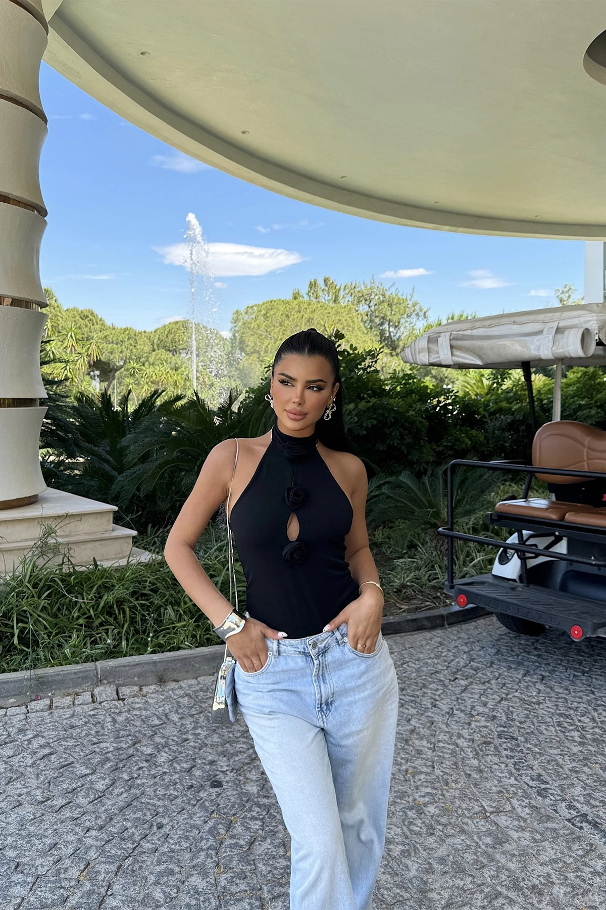 Black Rose Detail Tied Bodysuit Made from flexible Fabric Size S is used in the image Bodysuit Length:79cm Bust:30cm Model Measurements: Height: 160 Weight: 50 Chest: 80 Waist: 62 Hip: 94