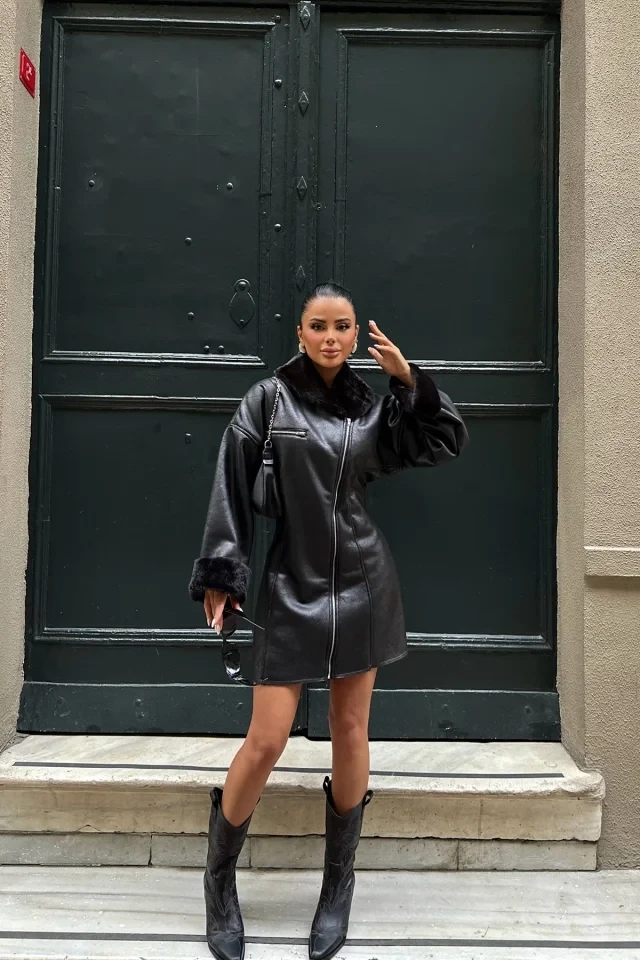 Black Fur Detail Coat Size S is used in the image Jacket Length:80cm Chest:58cm Model Measurements: Height: 160 Weight: 50 Chest: 80 Waist: 62 Hip: 94