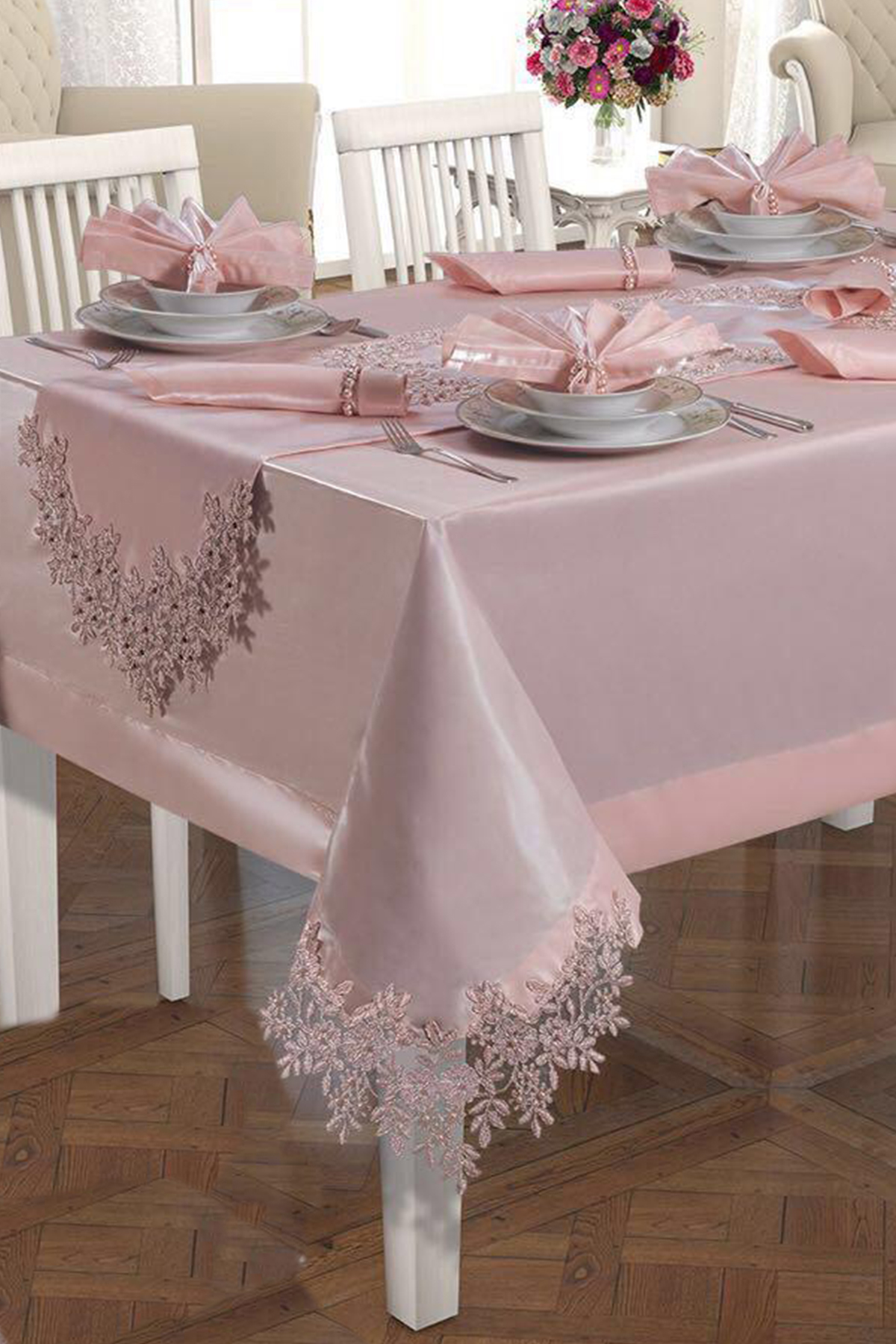 Fransız Güpürlü Angel Masa Örtüsü Takımı 26 Parça Pudra