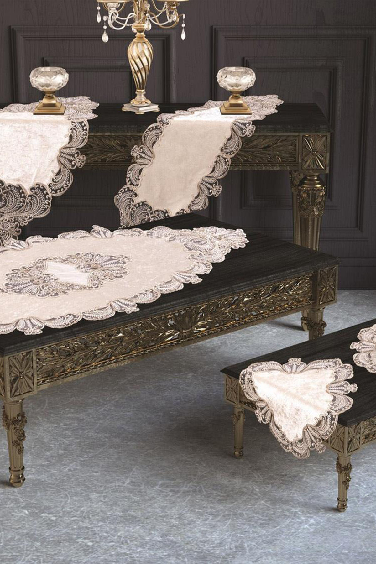 Fransız Güpürlü Kadife Salon Takımı 5 Parça Marka: Çeyiz Diyarı Masa Örtüsü 1 adet 60*130 cm Küçük Sehpa Örtüsü: 2 adet 45*45 cm Büyük Sehpa Örtüsü: 1 adet 45*90 cm Konsol Örtüsü: 1 adet 45*100cm YIKAMA TALİMATI -Makinada veya elde yıkayabilirsiniz max 40 derecede yıkayınız. -Çamaşır suyu ile leke sökücü kimyasallar kullanmayınız. -Yıkama esnasında koyu renkleri mümkün olduğunca ayrı tutunuz. -Ilık ütü ile ütüleyiniz. -Islak bekletmeyiniz. -Kurutma makinasında kurutulabilir.