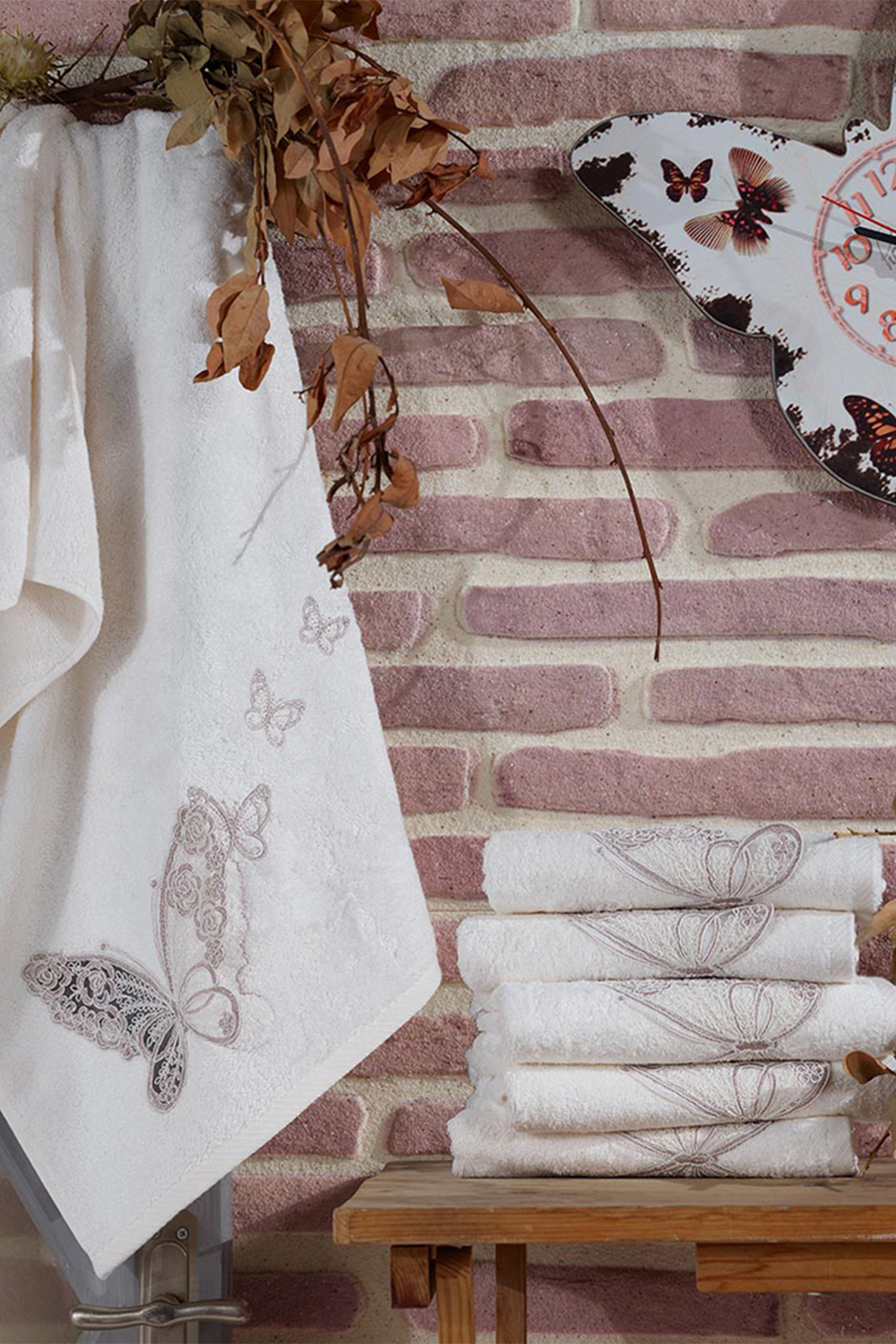 Fransız Güpürlü Nakışlı Ömrüm Çeyizlik Bambu Havlu Krem