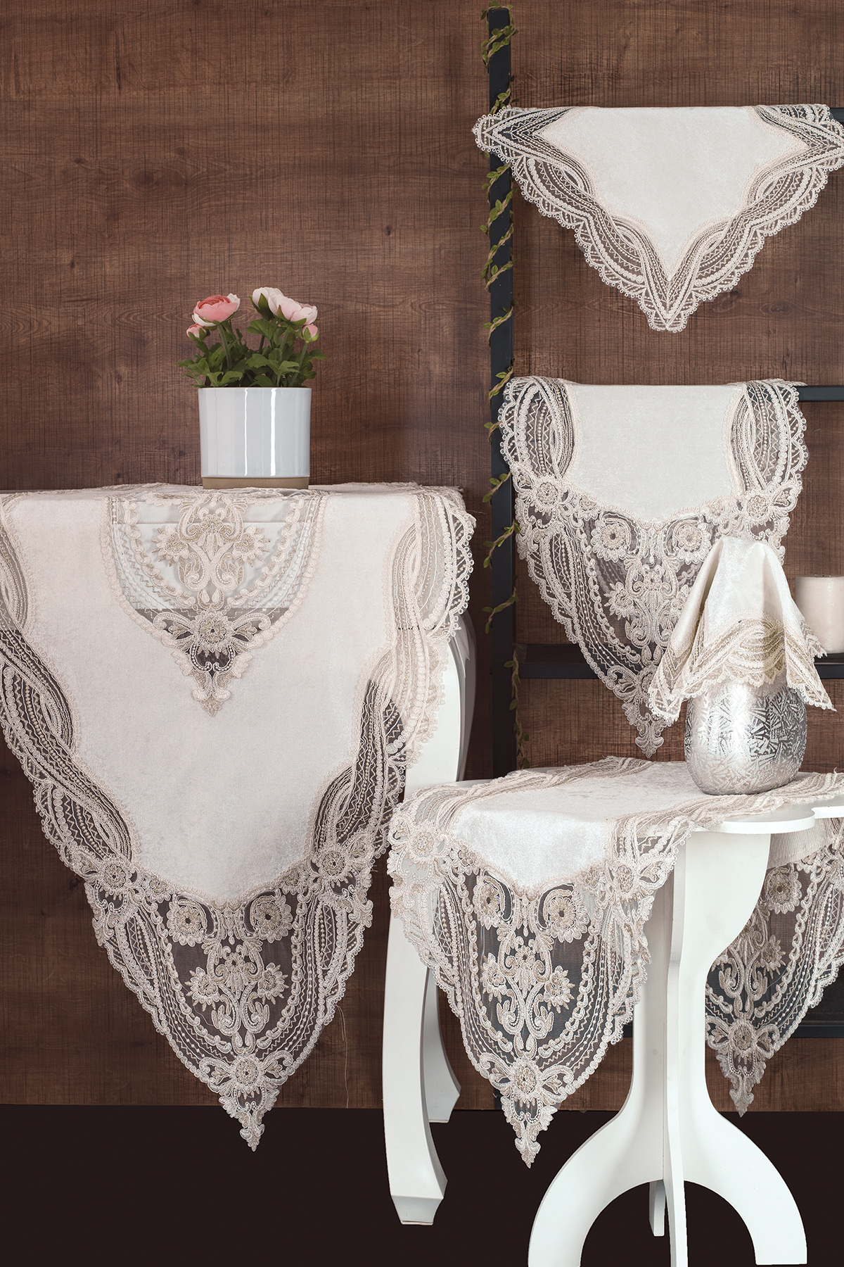 Fransız Güpürlü Kadife Lüks 5 Parça Salon Takımı Kadife kumaş etrafına fransız güpürü dikilerek öze bir tasarım oluşturulmuştur. Salonlarınıza zerafet ve şıklık katmak yada çeyiziniz için şık bir ürün sahibi olmak için tercih edebilirsiniz. Marka: Çeyiz Diyarı Yemel Masa Örtüsü: 160x65 cm 1 adet Konsol Örtüsü : 120x45 cm 1 adet Orta Sehpa Örtüsü: 105x45 cm 1 adet Yan Sehpa Örtüsü: 40x40 2 adet Ürünlerimiz 2 Yıl Çeyiz Diyarı Garantilidir.