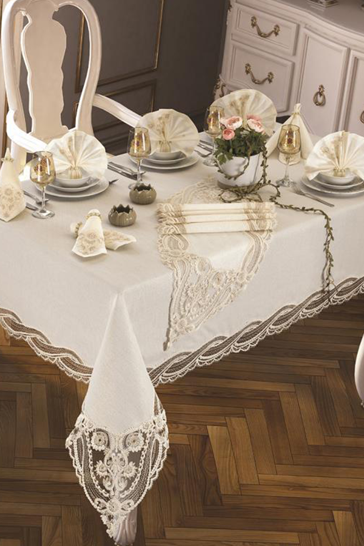 Dikdörtgen Masa Örtüsü Takım Marka : Çeyiz Diyarı Masa Örtüsü : 160x220 cm Runner : 45x135 cm Peçete : 35x40 cm 12 adet Yüzük 12 adet Leke Tutmaz Etuval Linen Kumaştan Kumaştan Üretilmiştir. Masa Örtüsünün Dört Çevresi ve Runner uçları Fransız Taşlı Güpürleri ile süslenerek özel bir tasarım oluşturulmuştur. Ürünlerimiz 2 yıl Ceyiz Diyari garantilidir. Ürünü beğenmeme durumunda koşulsuz iade hakkına sahipsiniz. YIKAMA TALİMATI -Makinada veya elde yıkayabilirsiniz max 40 derecede yıkayınız. -Çamaşır suyu ile leke sökücü kimyasallar kullanmayınız. -Yıkama esnasında koyu renkleri mümkün olduğunca ayrı tutunuz. -Ilık ütü ile ütüleyiniz. -Islak bekletmeyiniz. -Kurutma makinasında kurutulabilir.