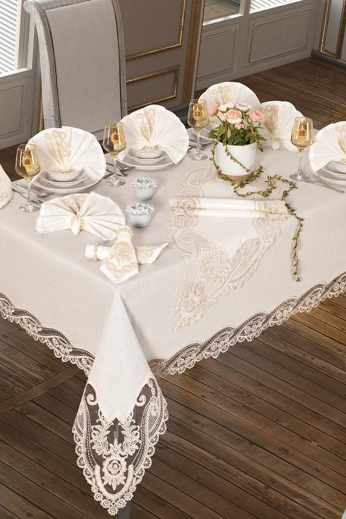 Dikdörtgen Masa Örtüsü Takım Marka : Çeyiz Diyarı Masa Örtüsü : 160x220 cm Runner : 45x135 cm Peçete : 35x40 cm 12 adet Yüzük 12 adet Leke Tutmaz Etuval Linen Kumaştan Kumaştan Üretilmiştir. Masa Örtüsünün Dört Çevresi ve Runner uçları Fransız Taşlı Güpürleri ile süslenerek özel bir tasarım oluşturulmuştur. Ürünlerimiz 2 yıl Ceyiz Diyari garantilidir. Ürünü beğenmeme durumunda koşulsuz iade hakkına sahipsiniz. YIKAMA TALİMATI -Makinada veya elde yıkayabilirsiniz max 40 derecede yıkayınız. -Çamaşır suyu ile leke sökücü kimyasallar kullanmayınız. -Yıkama esnasında koyu renkleri mümkün olduğunca ayrı tutunuz. -Ilık ütü ile ütüleyiniz. -Islak bekletmeyiniz. -Kurutma makinasında kurutulabilir.