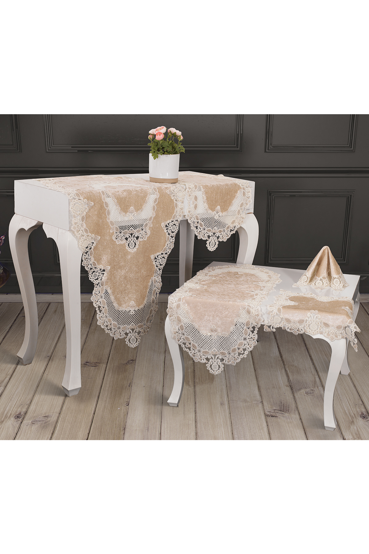 Fransız Güpürlü Kadife Lüks 5 Parça Salon Takımı Kadife kumaş etrafına fransız güpürü dikilerek öze bir tasarım oluşturulmuştur. Salonlarınıza zerafet ve şıklık katmak yada çeyiziniz için şık bir ürün sahibi olmak için tercih edebilirsiniz. Marka: Çeyiz Diyarı Yemel Masa Örtüsü: 160x65 cm 1 adet Konsol Örtüsü : 120x45 cm 1 adet Orta Sehpa Örtüsü: 105x45 cm 1 adet Yan Sehpa Örtüsü: 40x40 2 adet Ürünlerimiz 2 Yıl Çeyiz Diyarı Garantilidir.