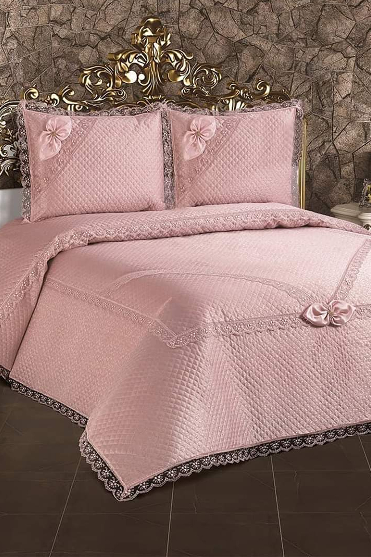 Gelincik Kapitoneli Fransız Güpürlü Yatak Örtüsü Pudra
