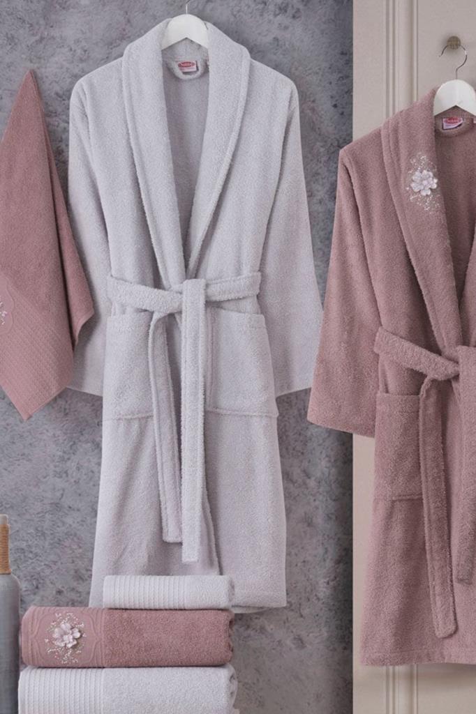 Line %100 Pamuk 6 Parça Aile Bornoz Takımı Gül Kurusu - Açık Gri