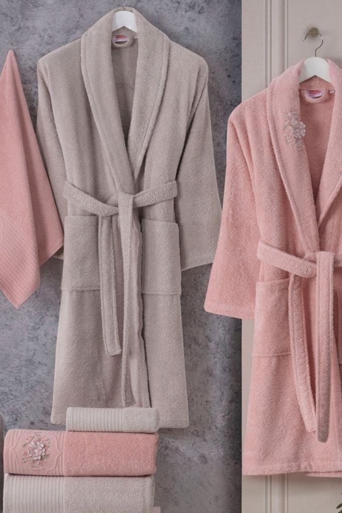Line %100 Pamuk 6 Parça Aile Bornoz Takımı Pembe - Koyu Bej