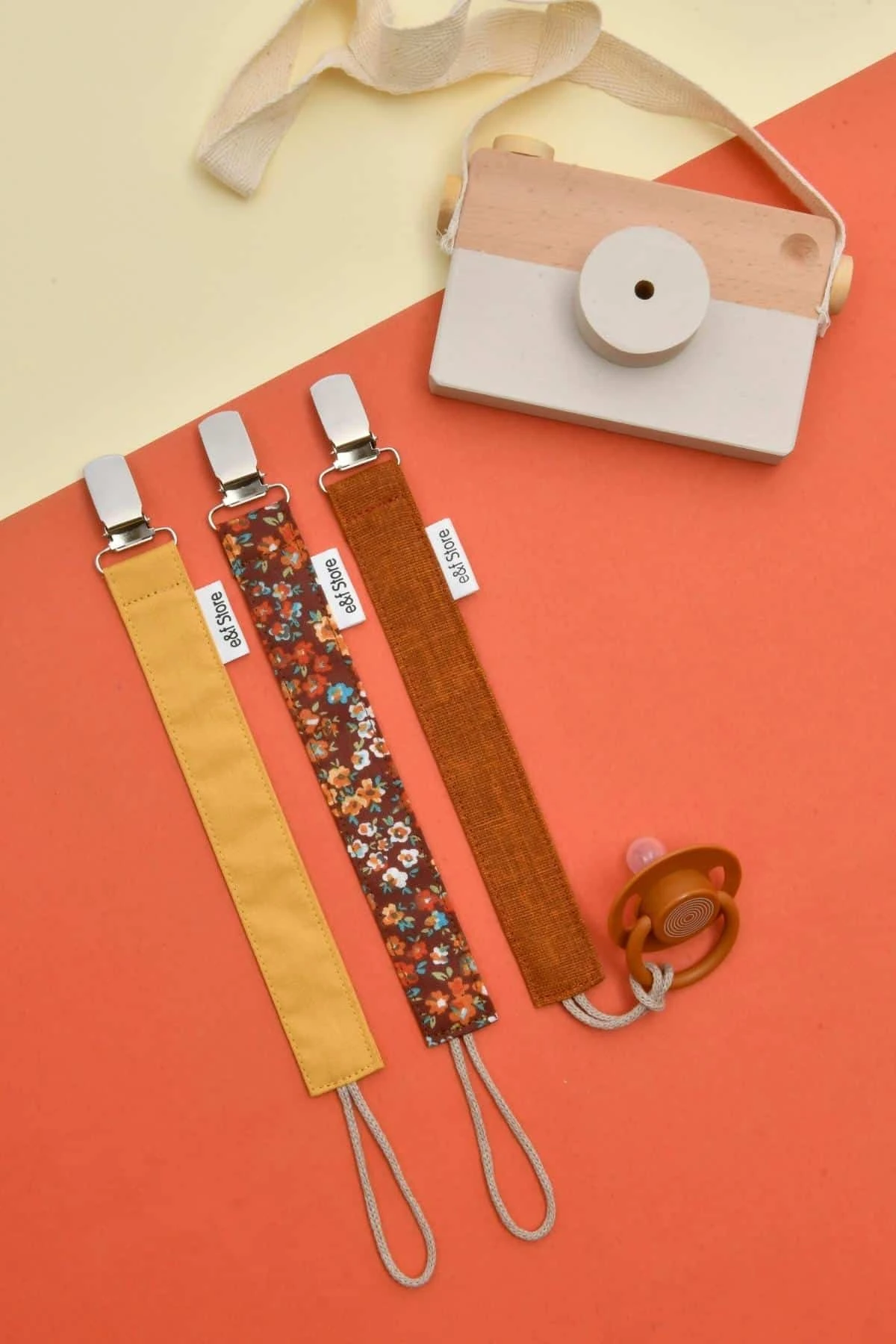 Yerli üretimdir ve El Yapımıdır. %100 Pamuk Poplin Kumaş, %100 Pamuk İp ve Nikel Kaplı Metal Kullanılmıştır. Oldukça Pratik Olan Emzik Askısını Tüm Kıyafetlere Kolayca Takabilirsiniz. Kopmaya Dayanıklıdır. Elde Yıkamaya Uygundur. Boyutları: 2,5 cm*27 cm 3 Adet Olarak Gönderilmektedir. Bebek Hediyesi Paketinin İçeriği:1 Adet Kiremit, 1 Adet Hardal Sarısı, 1 Adet Kahverengi Çiçekli UYARI: Küçük Parçalar İçerdiği İçin Yetişkin Gözetiminde Kullanılmalıdır.