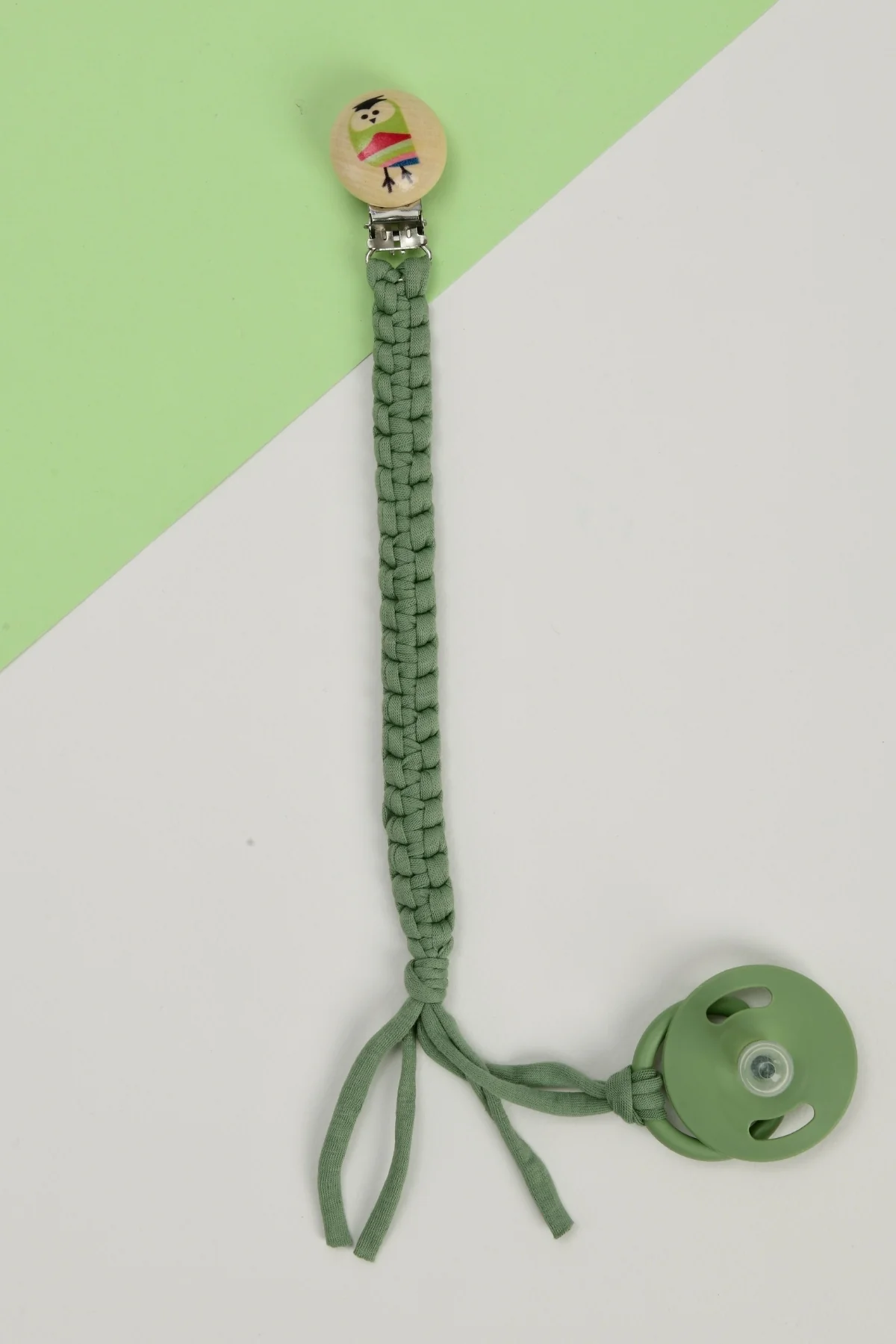 El Örmesi Doğal Ahşap Emzik Askısı - Baykuş - Yeşil