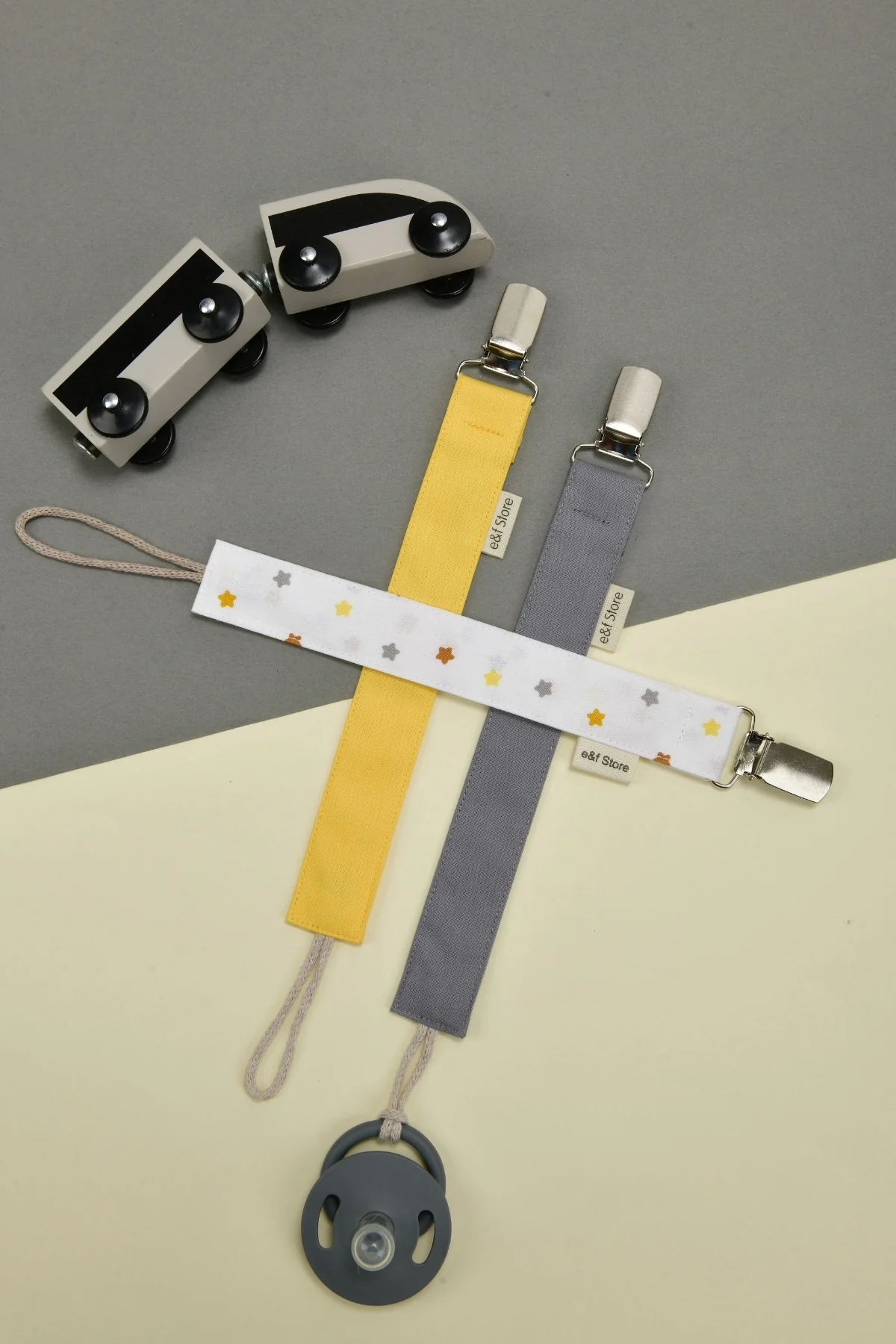 Yerli üretimdir ve El Yapımıdır. %100 Pamuk Poplin Kumaş, %100 Pamuk İp ve Nikel Kaplı Metal Kullanılmıştır. Oldukça Pratik Olan Emzik Askısını Tüm Kıyafetlere Kolayca Takabilirsiniz. Kopmaya Dayanıklıdır. Elde Yıkamaya Uygundur. Boyutları: 2,5 cm*27 cm 3 Adet Olarak Gönderilmektedir. Bebek Hediyesi Paketinin İçeriği:1 Adet Yıldız Desenli Beyaz, 1 Adet Gri, 1 Adet Sarı UYARI: Küçük Parçalar İçerdiği İçin Yetişkin Gözetiminde Kullanılmalıdır.