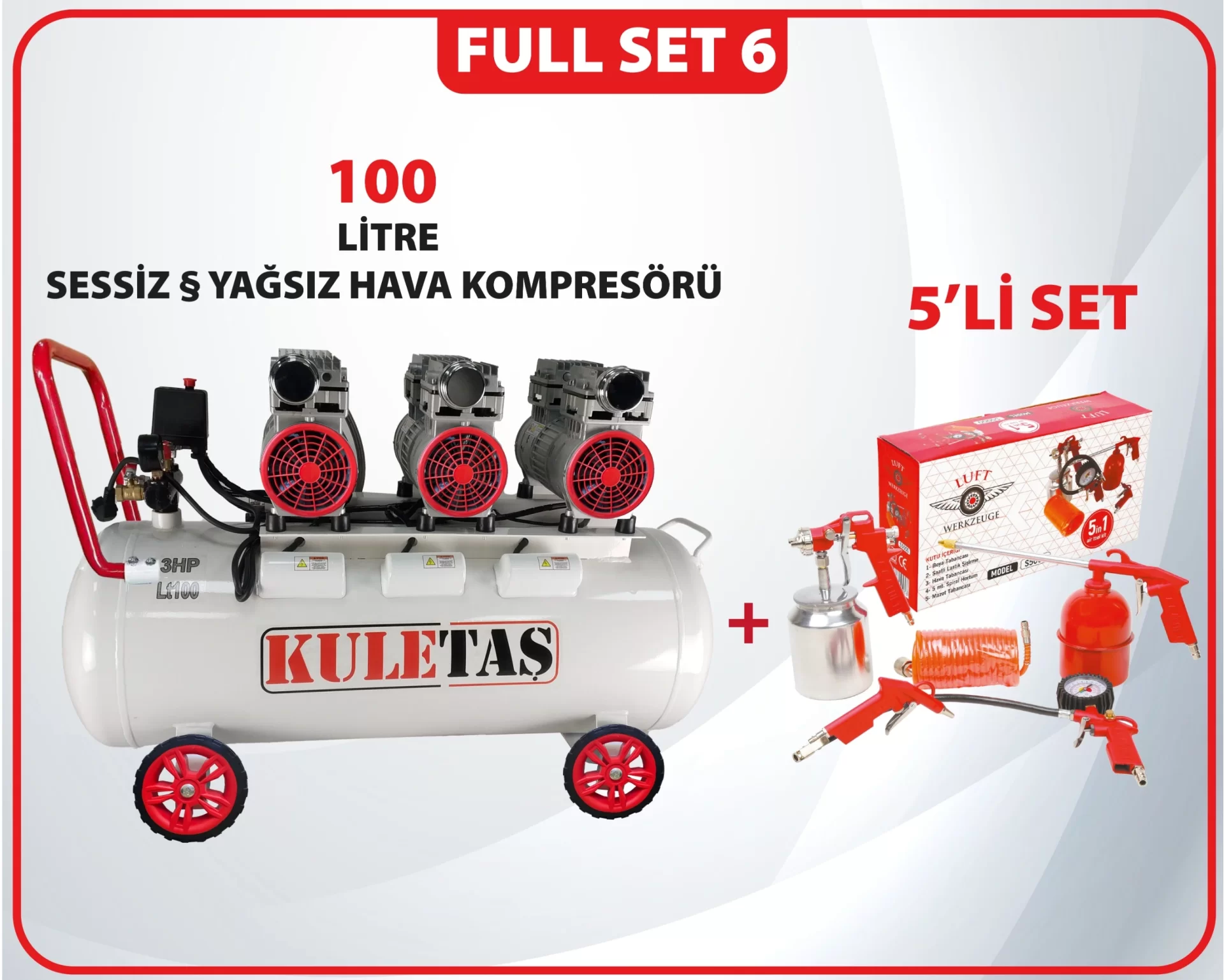 Full Set 6 Kuletaş Süper Sessiz Yağsız Kompresör 100 Litre +5 Li Havalı Alet Seti