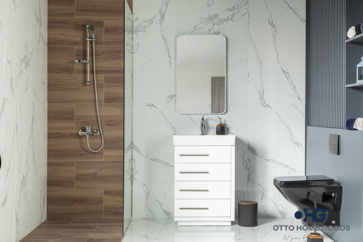 Adora 32″ White Bathroom Cabinet modeli, 36″ H × 32″ W × 18″ D ölçülerinde, entegre porselen lavabo ve üst yüzeyiyle birlikte gelir. Gövdesi işlenmiş (engineered) ahşap malzemeden üretilmiştir. Çekmeceleri dovetail yapıdadır ve soft-close özelliğiyle sessiz kapanma sağlar; donanım olarak Alman marka Hettich tercih edilmiştir.
