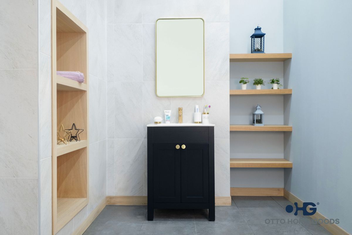 Aria 24″ Black Bathroom Cabinet, kompakt ölçülerde (34″ × 24″ × 18″) modern banyolar için tasarlanmıştır. Entegre porselen lavabo ve üst yüzey ile gelir. Masif ahşap ayaklar, HDF gövde ve kapaklar uzun ömürlü kullanım sağlar. Soft-Close kapılar ve dovetail çekmeceler Hettich marka donanımla desteklenmiştir.