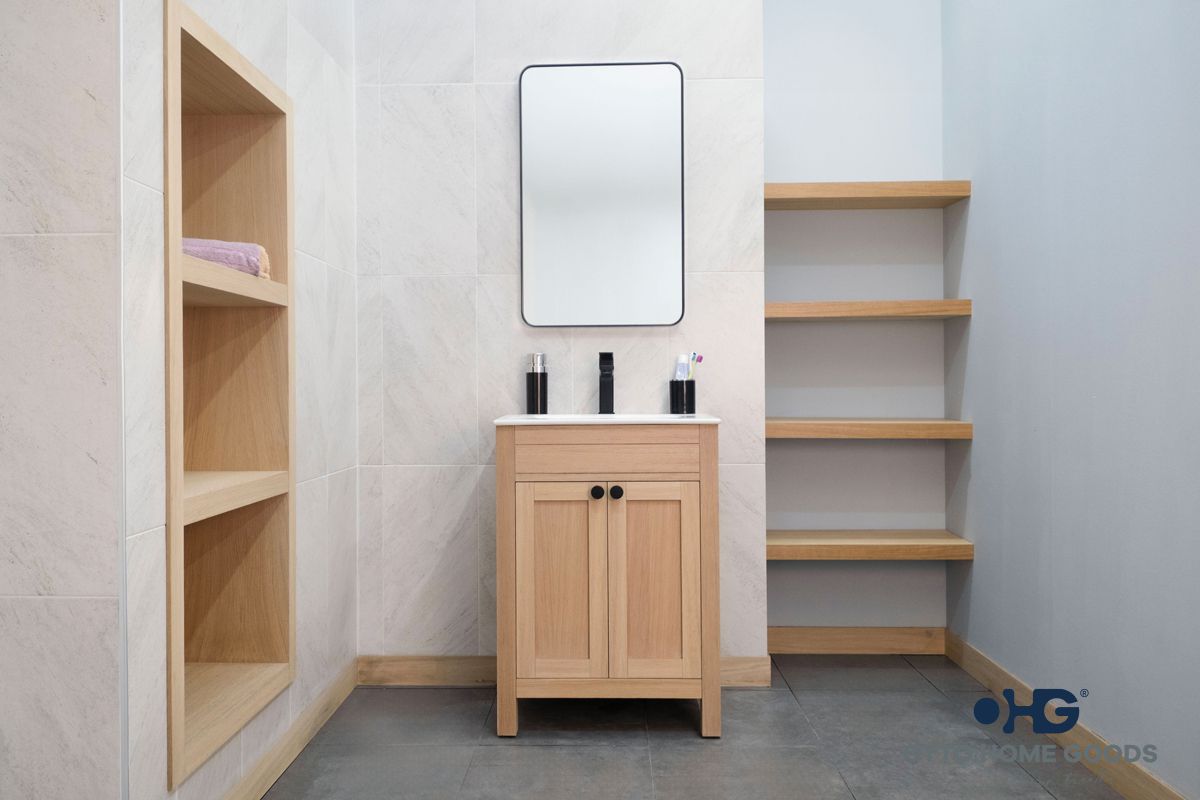 Aria 24″ Natural Oak Bathroom Cabinet, 34" H × (24,30,36)" W× 18" D ölçülerindedir. Entegre porselen lavabo üst yüzeyi ile birlikte gelir. Ayaklar masif ahşap (solid wood), gövde ve kapaklar HDF malzemeden üretilmiştir. Kapılar soft-close özelliklidir ve donanım olarak Alman Hettich marka mekanizmalar kullanılmıştır. Standart gelen donanım siyah kulplardır; Brass/Gold ve Brushed Nickel donanım seçenekleri de opsiyonel olarak mevcuttur. Aria serisi renk varyantlarında Natural Oak versiyonu ile sıcak ve doğal bir hava sunar. Teknik çizim belgeleriyle montaj ve detaylı ölçü bilgileri desteklenmiştir.