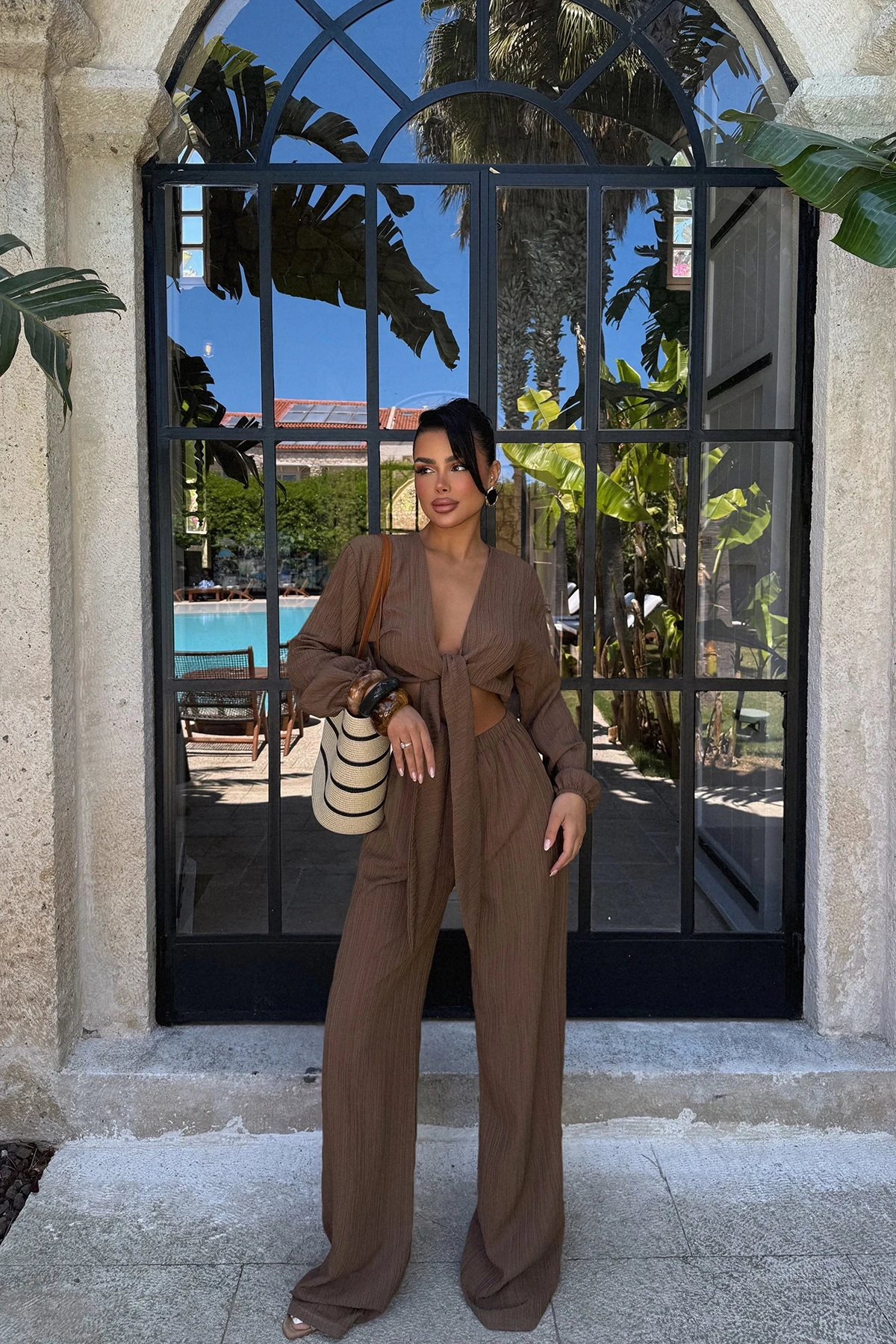 Beige Adelina Tie-Up Suit Made of Woven Bürümcük fabric. The image uses size XS. Suit top length 36 cm, Chest 43 cm, Bottom length 111 cm, Waist 34 cm, Hips 54 cm Model Measurements Height: 160 Weight: 50 Chest: 80 Waist: 62 Hips: 94