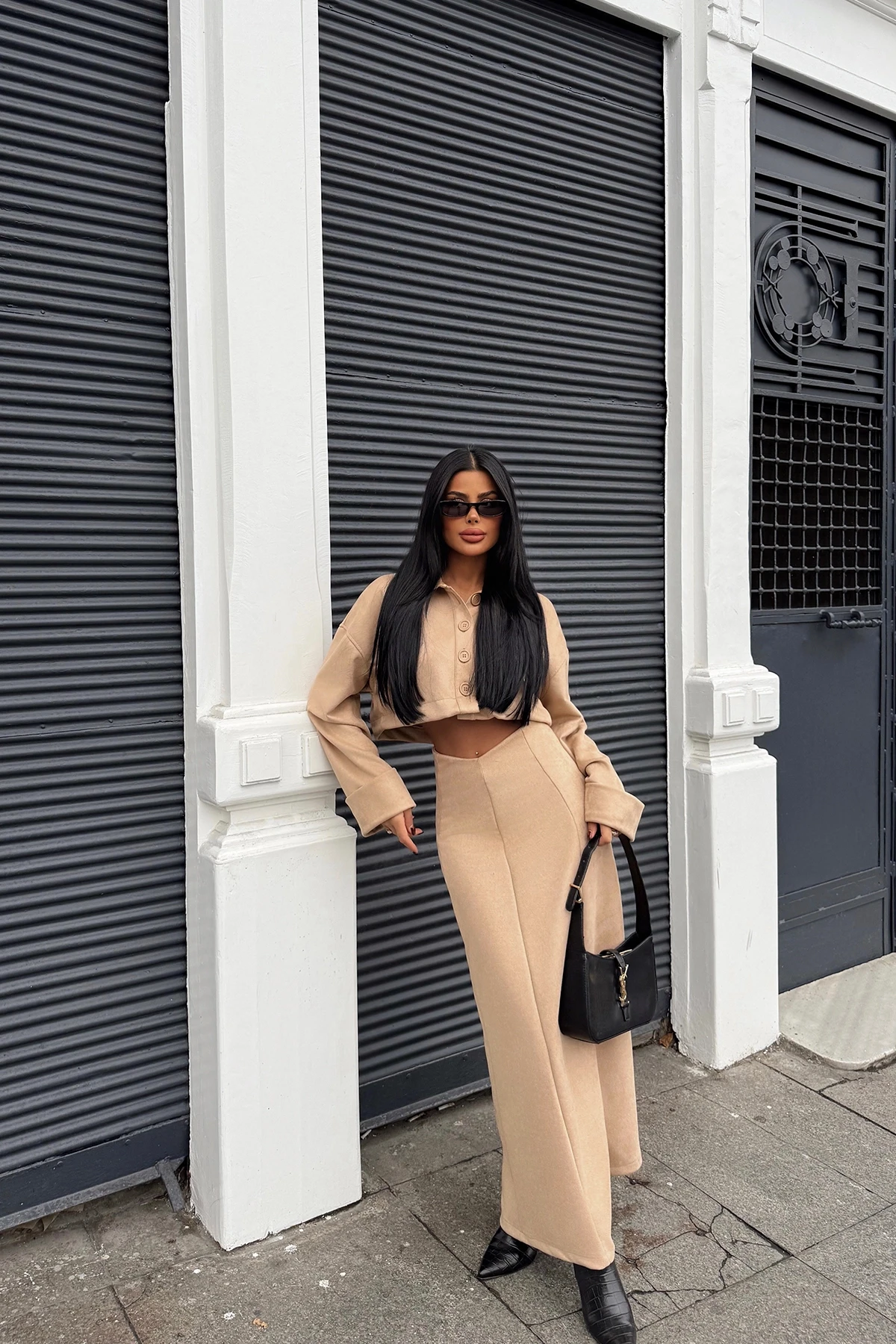 Beige Button-Front Suit Size XS is used in the image. Top Length: 41 Cm Bust: 54 Cm Bottom Length: 89 Cm Waist: 36 Cm Model Measurements Height 158 ​​Weight 52 Chest 80 Waist 62 Hip 93