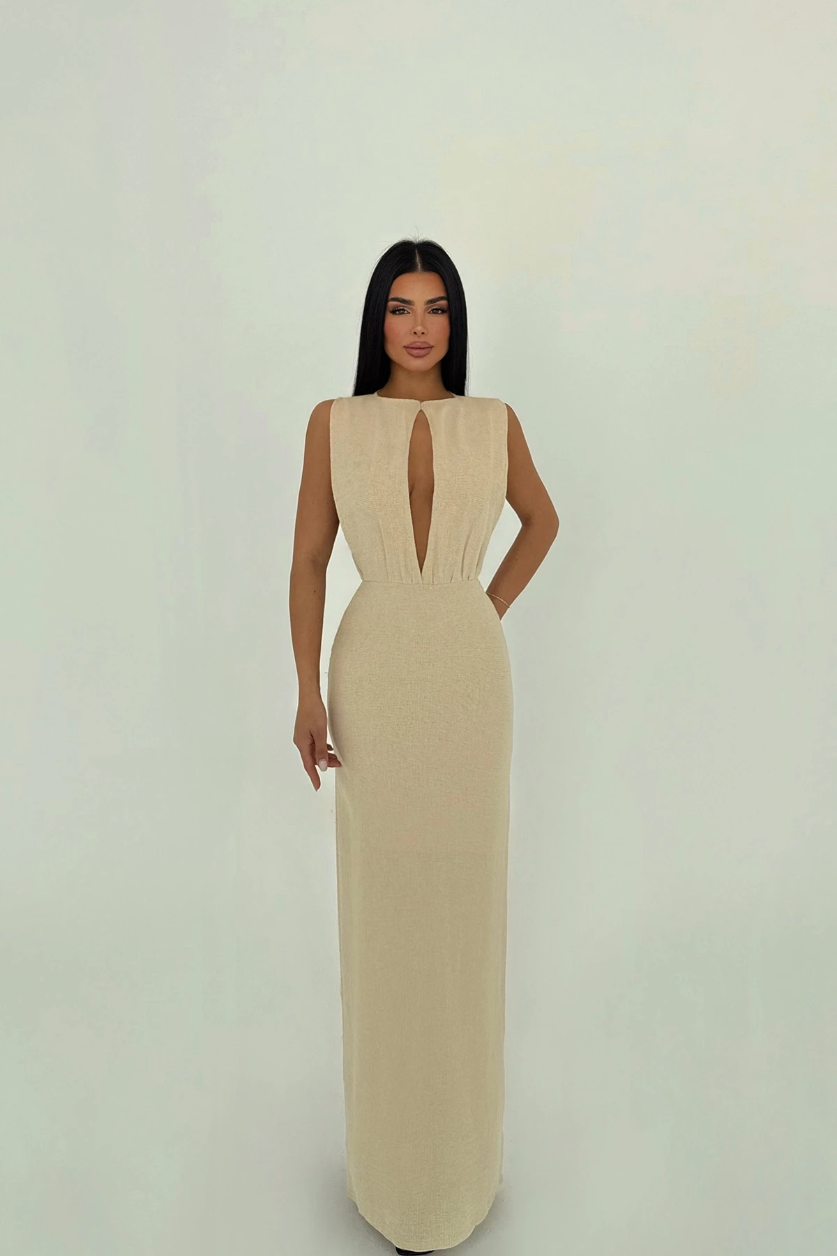 Beige Himari Dress Size XS is used in the image. Dress Length: 134 Cm Waist: 34 Cm Bust: 37 Cm Model Measurements Height 158 ​​Weight 52 Chest 80 Waist 62 Hip 93