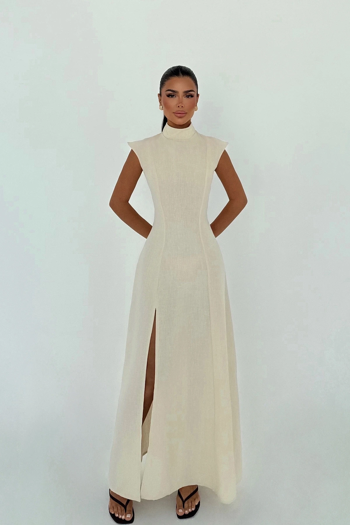 Beige Slit Detail Dress The image shows a size XS. Height: 137 cm, Waist: 34 cm, Chest: 39 cm Model Measurements: Height: 158 cm, Weight: 52 cm, Chest: 80 cm, Waist: 62 cm, Hips: 93 cm