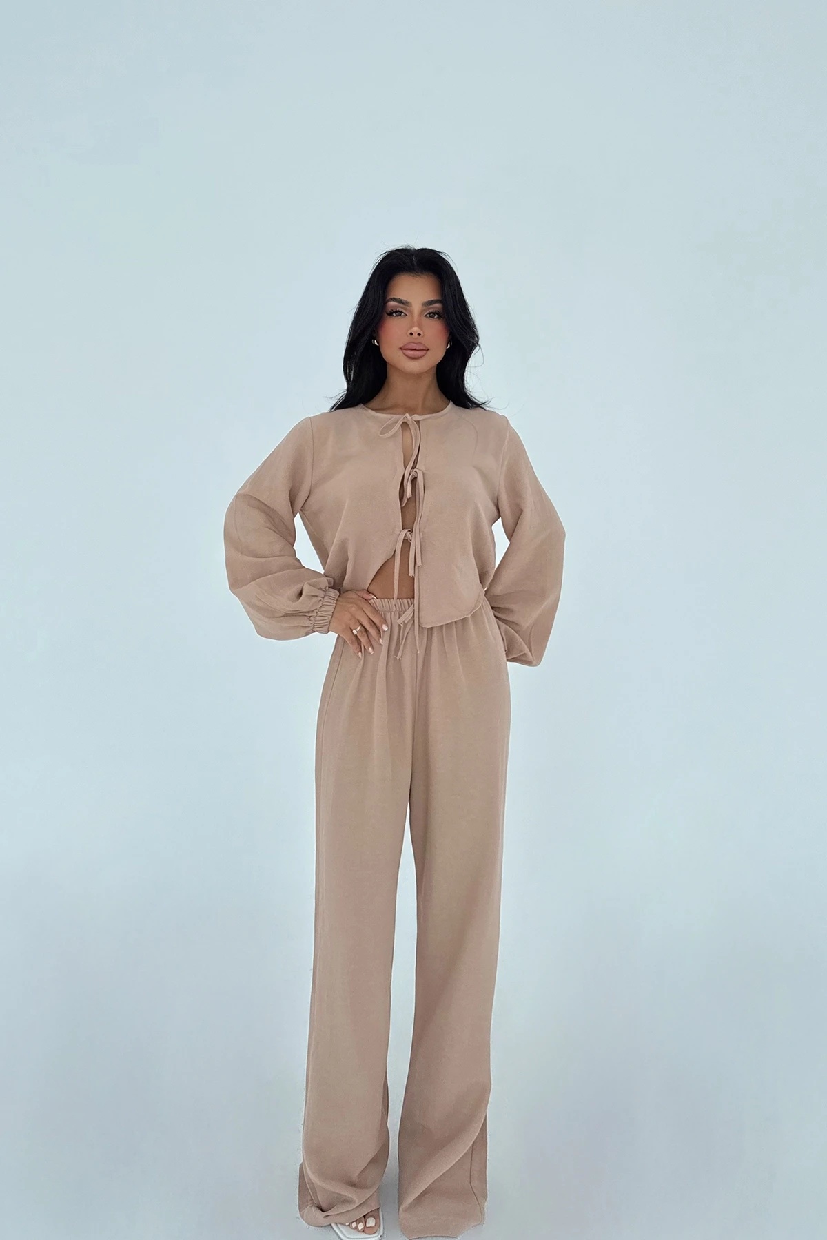Beige Tied Trouser Suit XS size is used in the image. Made of Linen Fabric. Upper Length: 45 cm Chest: 49 cm Lower Length: 104 cm Waist: 36 cm Model Measurements Height 158 ​​Weight 52 Chest 80 Waist 62 Hip 93
